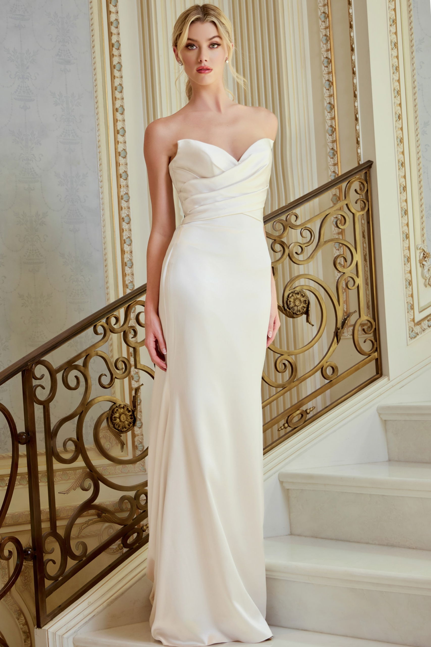 Draped Bodice, Smooth Skirt, Soft Sweep Train