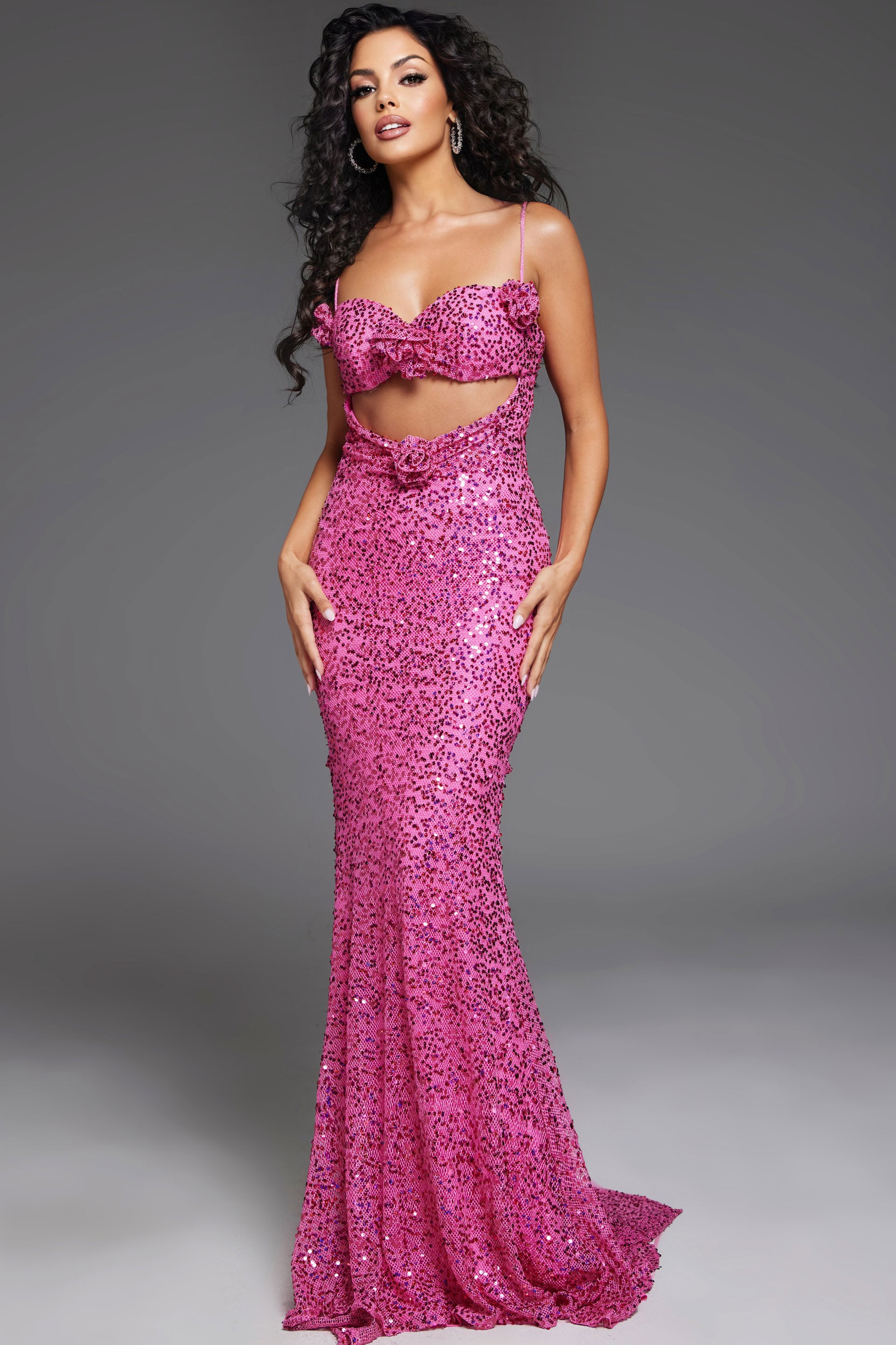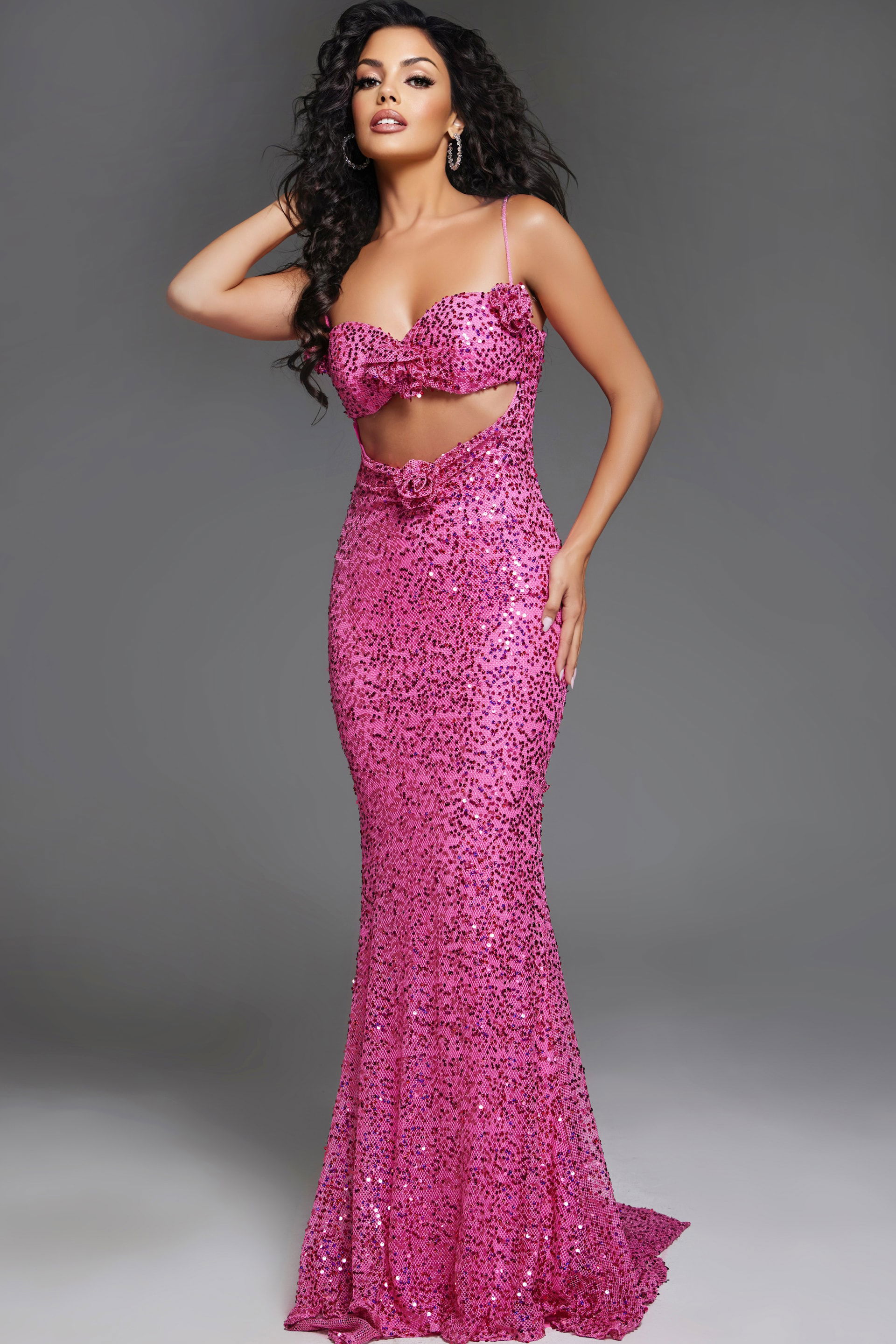 This captivating hot pink gown features a fitted silhouette with a flared hemline, showcasing a glamorous sequin pattern throughout. The dress highlights a sweetheart neckline adorned with delicate floral details, complemented by thin shoulder straps. The midriff cut-out design adds a touch of allure, while the open back enhances its elegance.