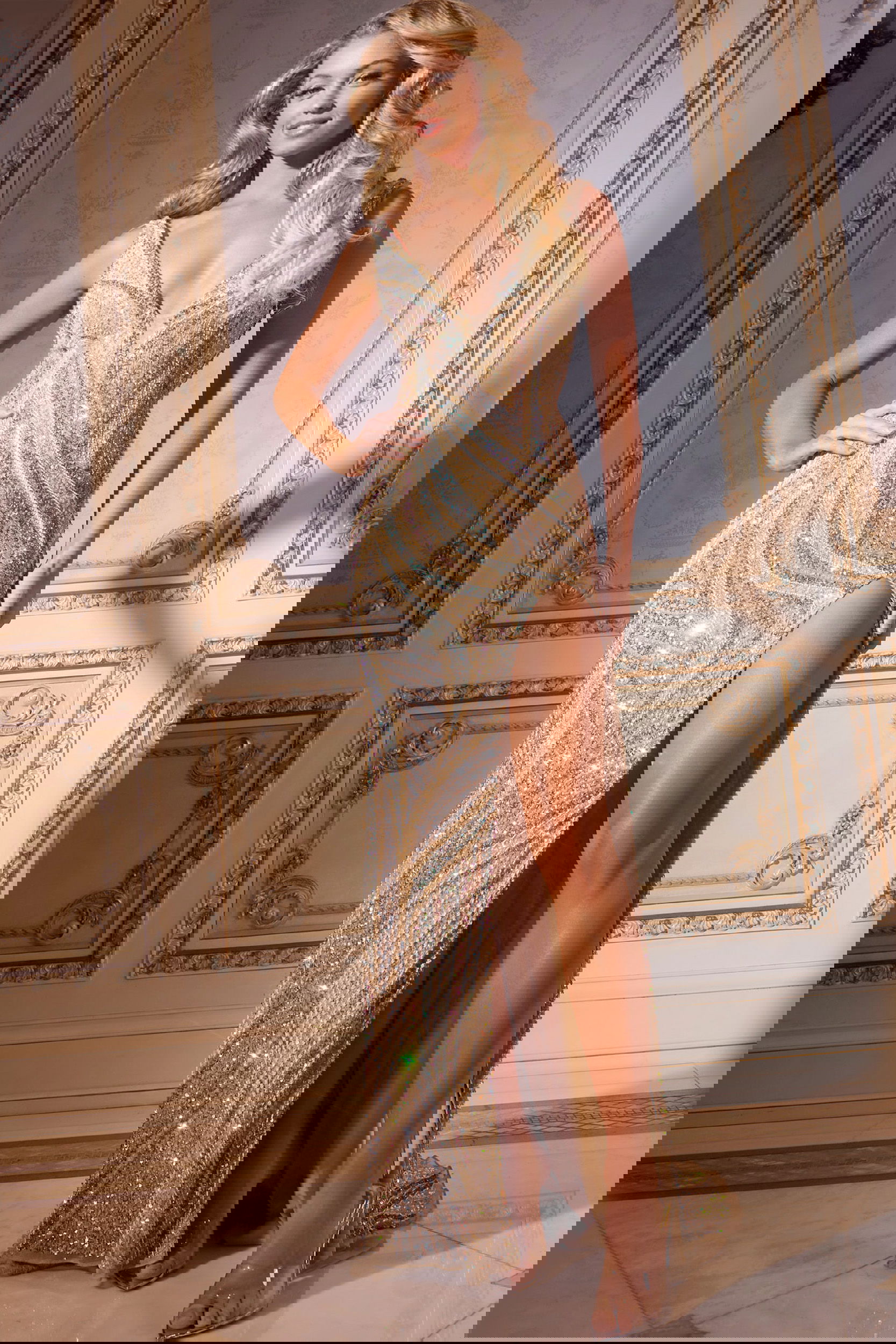 High Slit, Iridescent Sequin Pattern, Fitted Bodice, Train Detail