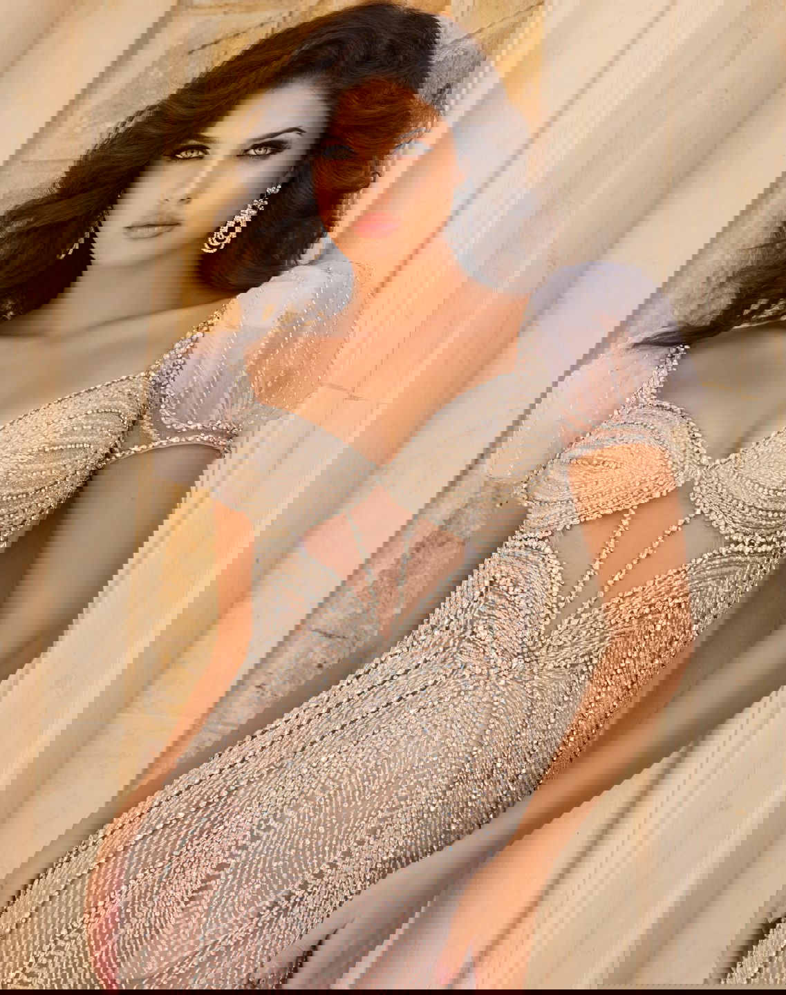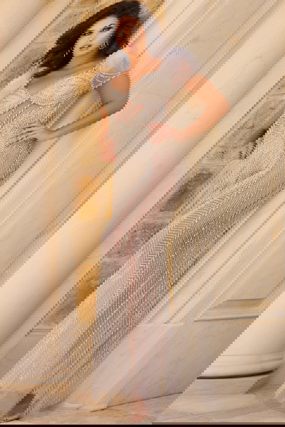 Captivating full-length gown featuring an alluring sheer beaded design that exudes elegance. The dress boasts a fitted silhouette that gracefully flows to the floor. It includes a sweetheart neckline that enhances its romantic appeal, while the short puff sleeves add a touch of playful sophistication. The intricately designed beadwork throughout the dress ensures all eyes are on you.