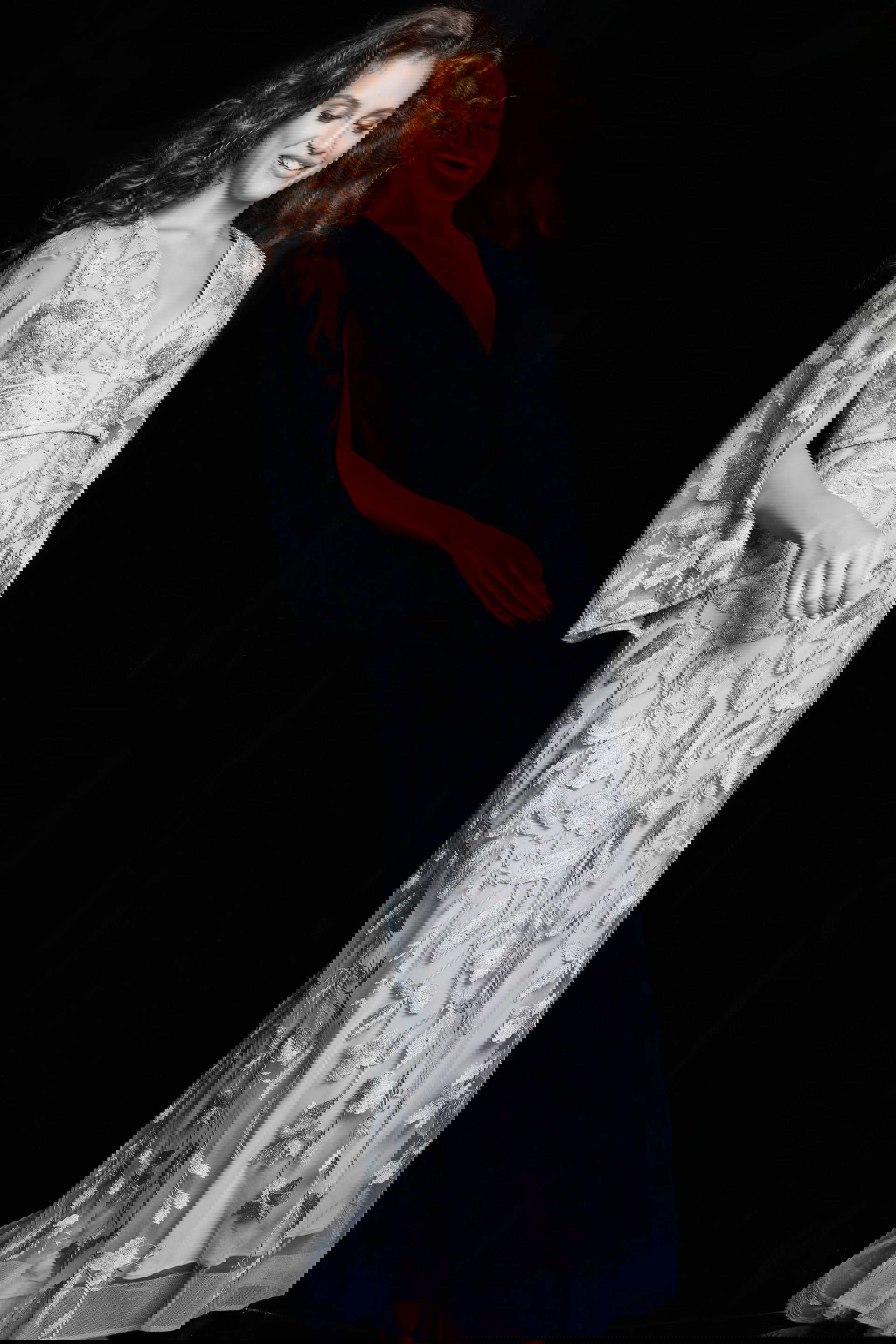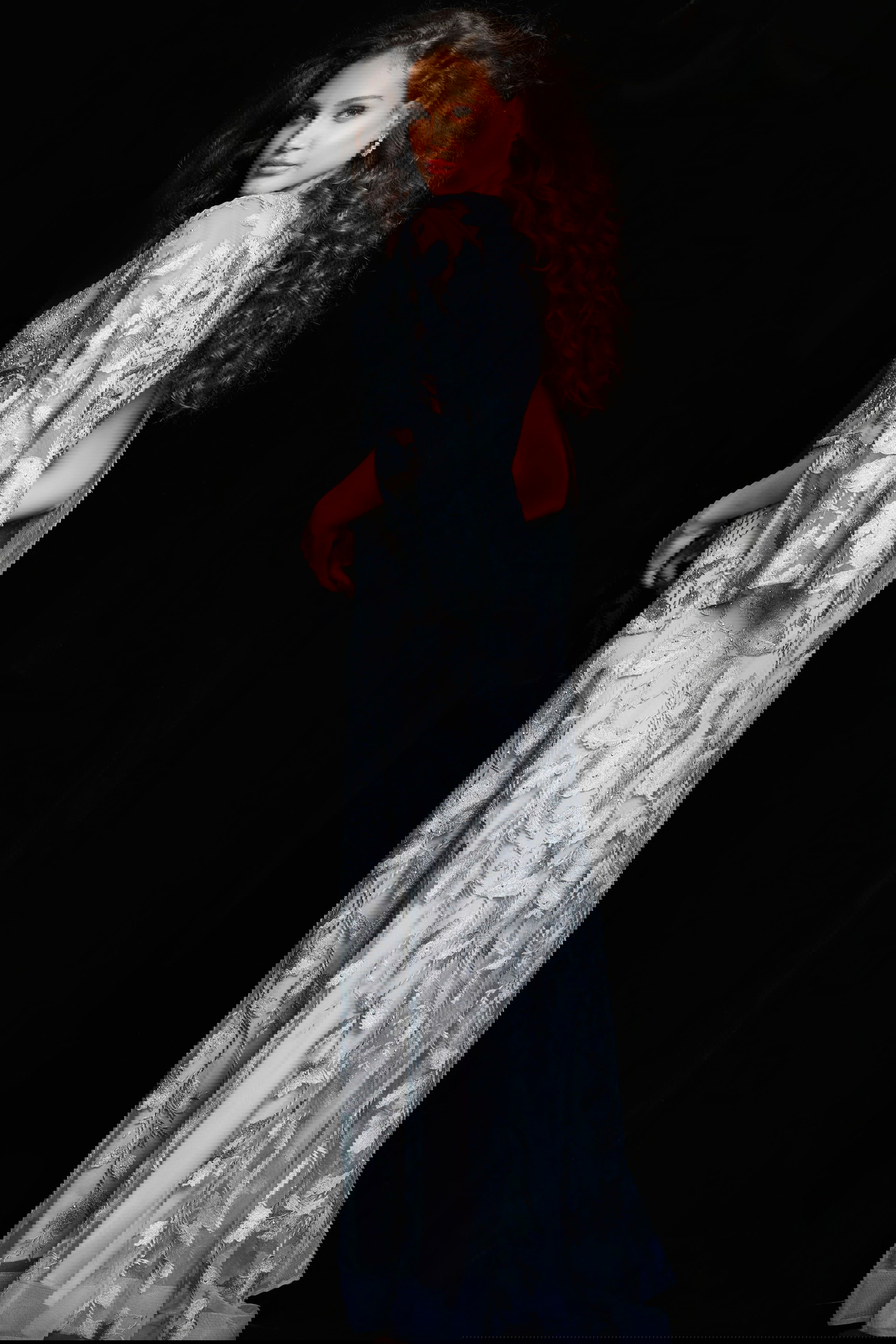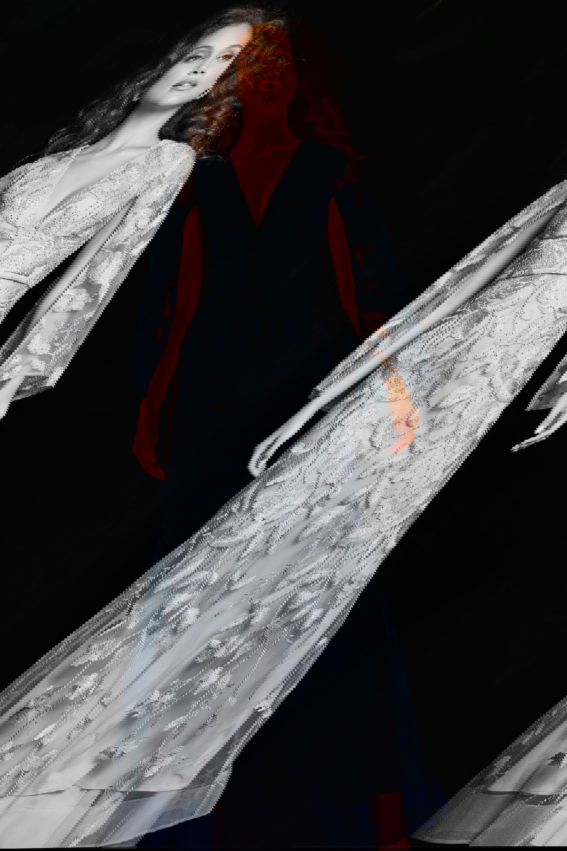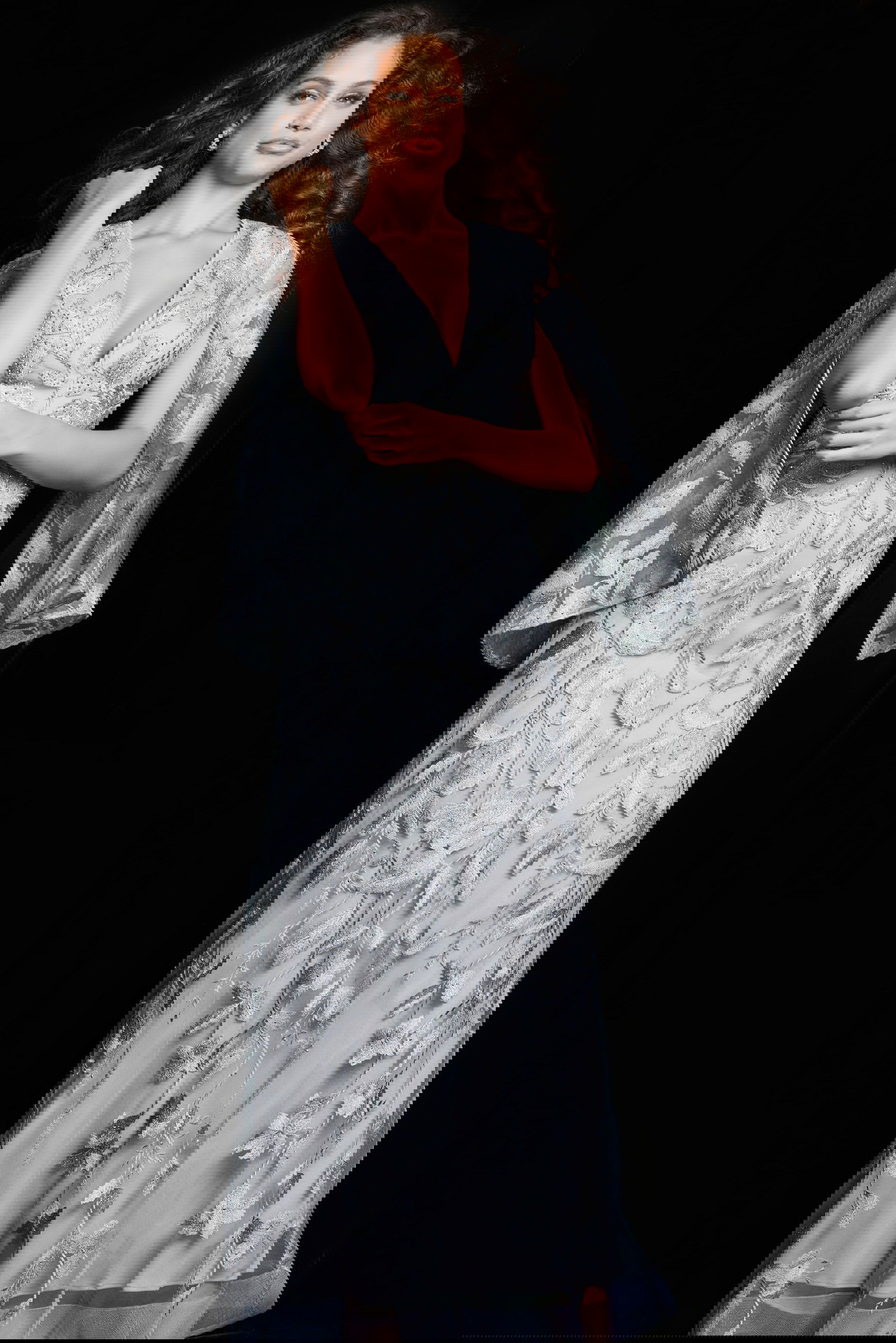 Key details include scattered stones, adding a touch of subtle glamour and sophistication, and sheer sleeves that provide an elegant and ethereal quality to the ensemble.