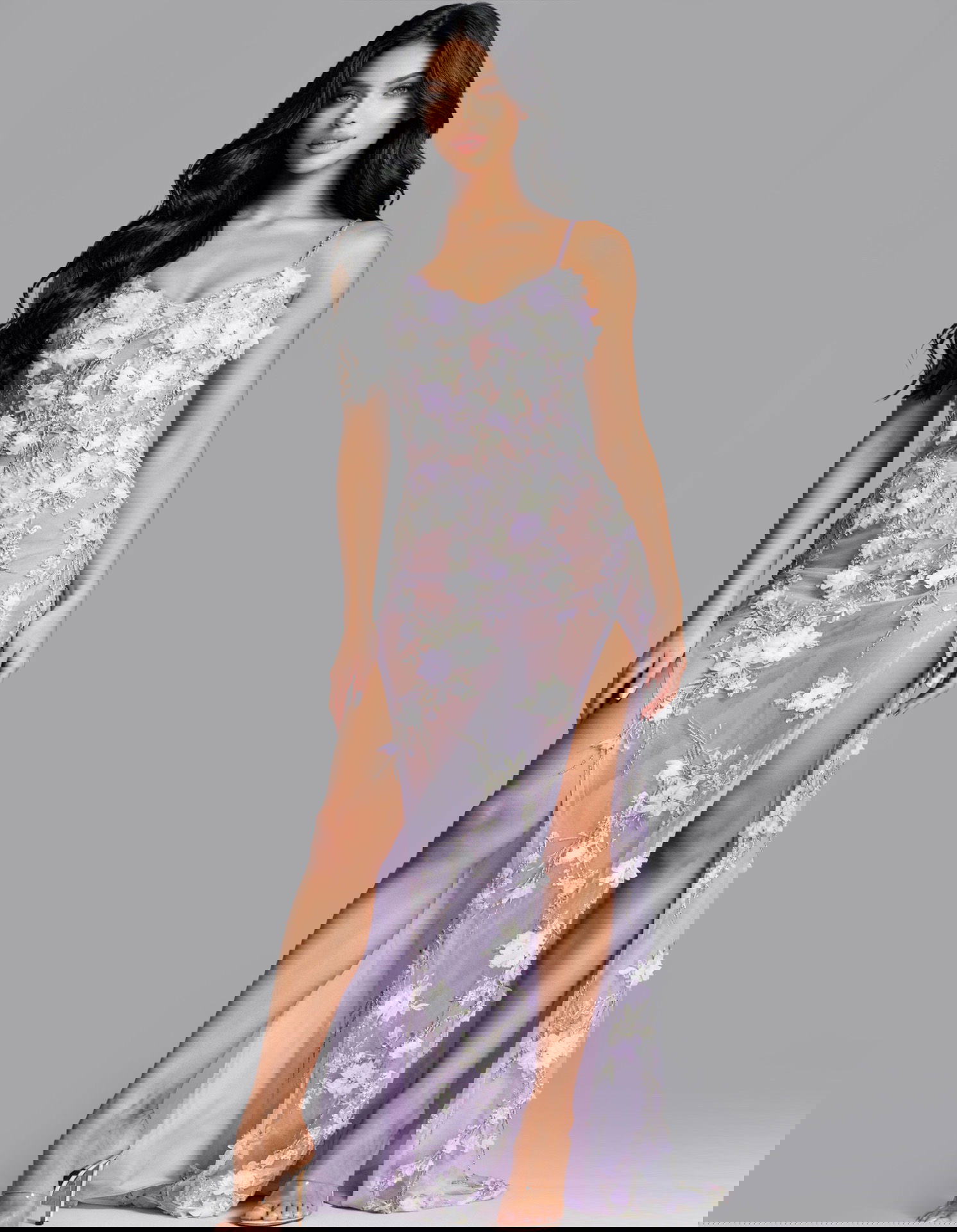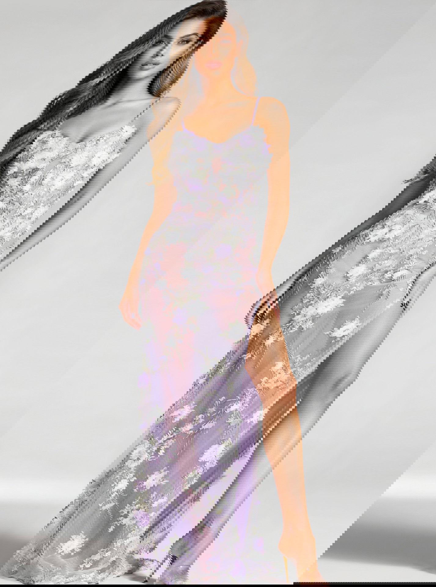 This elegant evening gown in lilac features a fitted silhouette with a floor-length design and a daring high slit. The dress boasts a mesmerizing illusion neckline adorned with intricate floral appliques, adding a touch of romance and sophistication. Its sleeveless design highlights the shoulders, while the sheer overlay exudes ethereal charm. Perfect for making a lasting impression at any formal event.