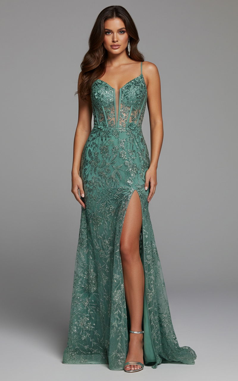 Elevate your evening with this stunning A-line gown, featuring delicate spaghetti straps and a daring plunging neckline. The floor-length silhouette flows beautifully with a high slit, adding a touch of drama. Intricate sequin embellishments cascade down the gown, creating a mesmerizing sparkle with every movement. The sheer bodice is artfully adorned with floral lace appliques, enhancing the romantic appeal of this enchanting dress.