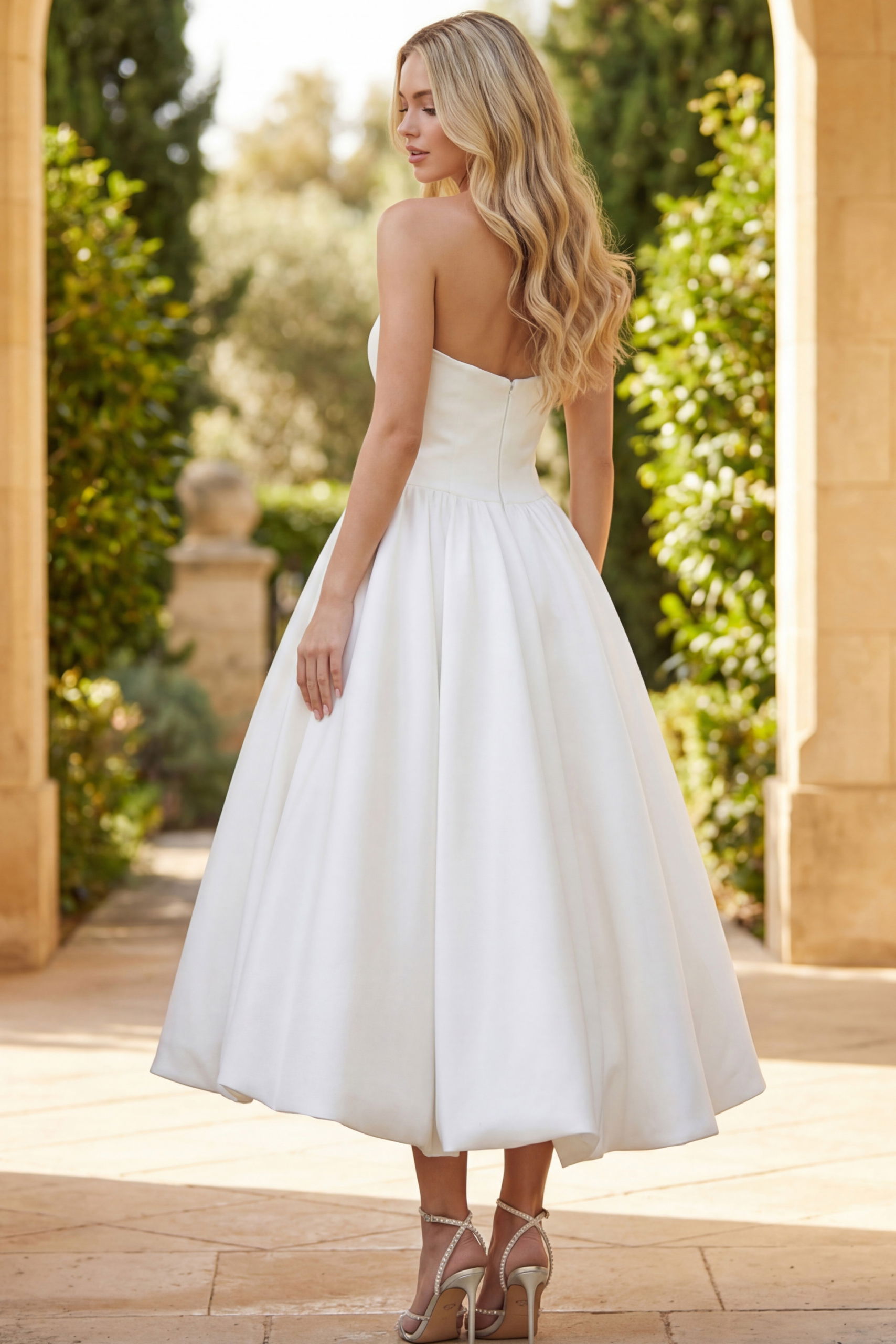 This elegant white dress features a captivating high-low hemline that adds a modern twist to a classic design. The silhouette is gently fitted through the bodice, ensuring a sleek and flattering fit. It boasts a strapless neckline that accentuates the shoulders, offering a timeless appeal. The dress has a voluminous skirt that falls gracefully, enhancing the overall romantic feel. Perfect for special occasions, this dress combines sophistication and style seamlessly.