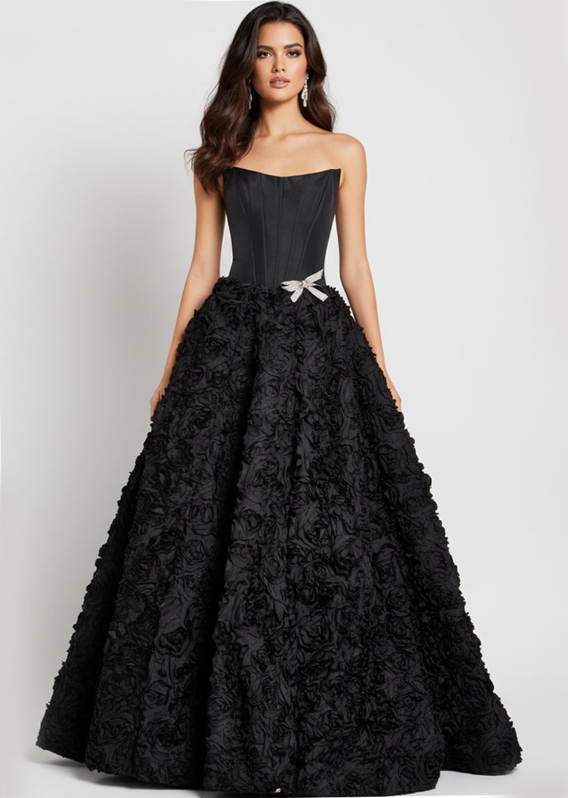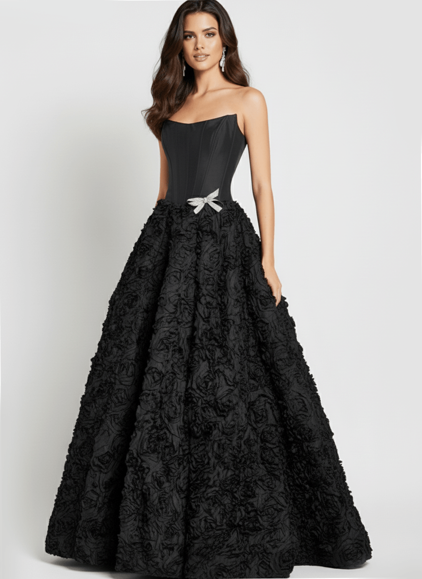 Corset Bodice, 3D Rosette Skirt, Rhinestone Bow Accent at Waist
