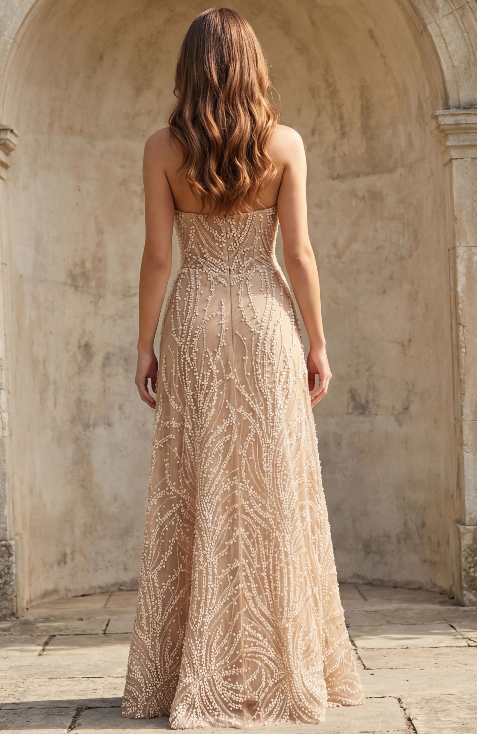 Allover swirling embroidery, softly structured bodice, flowing skirt