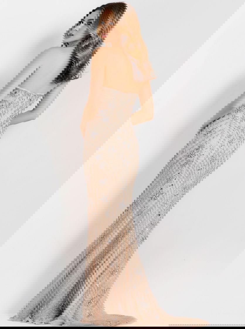 Strapless Beaded Nude Mesh Mermaid Gown 48389