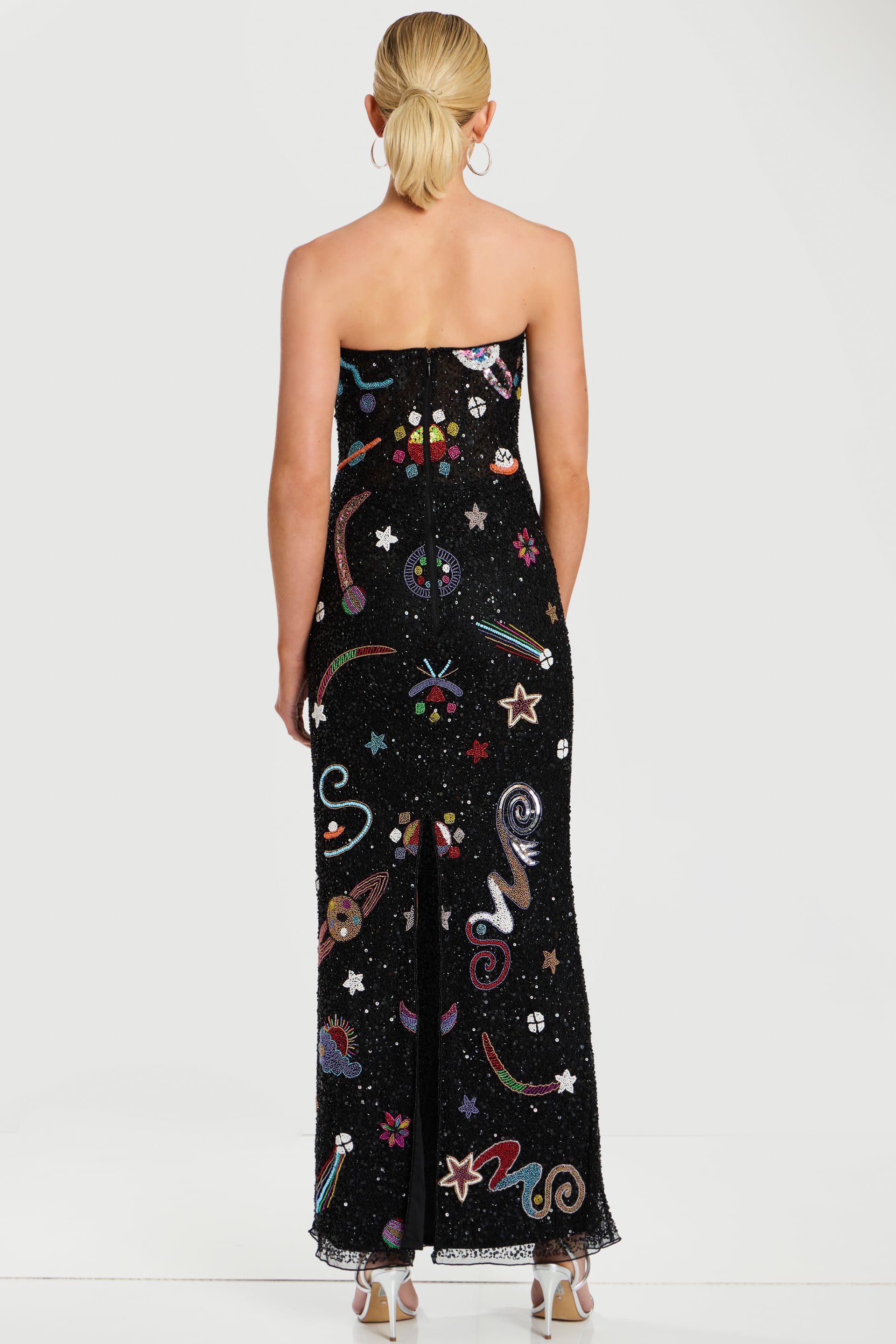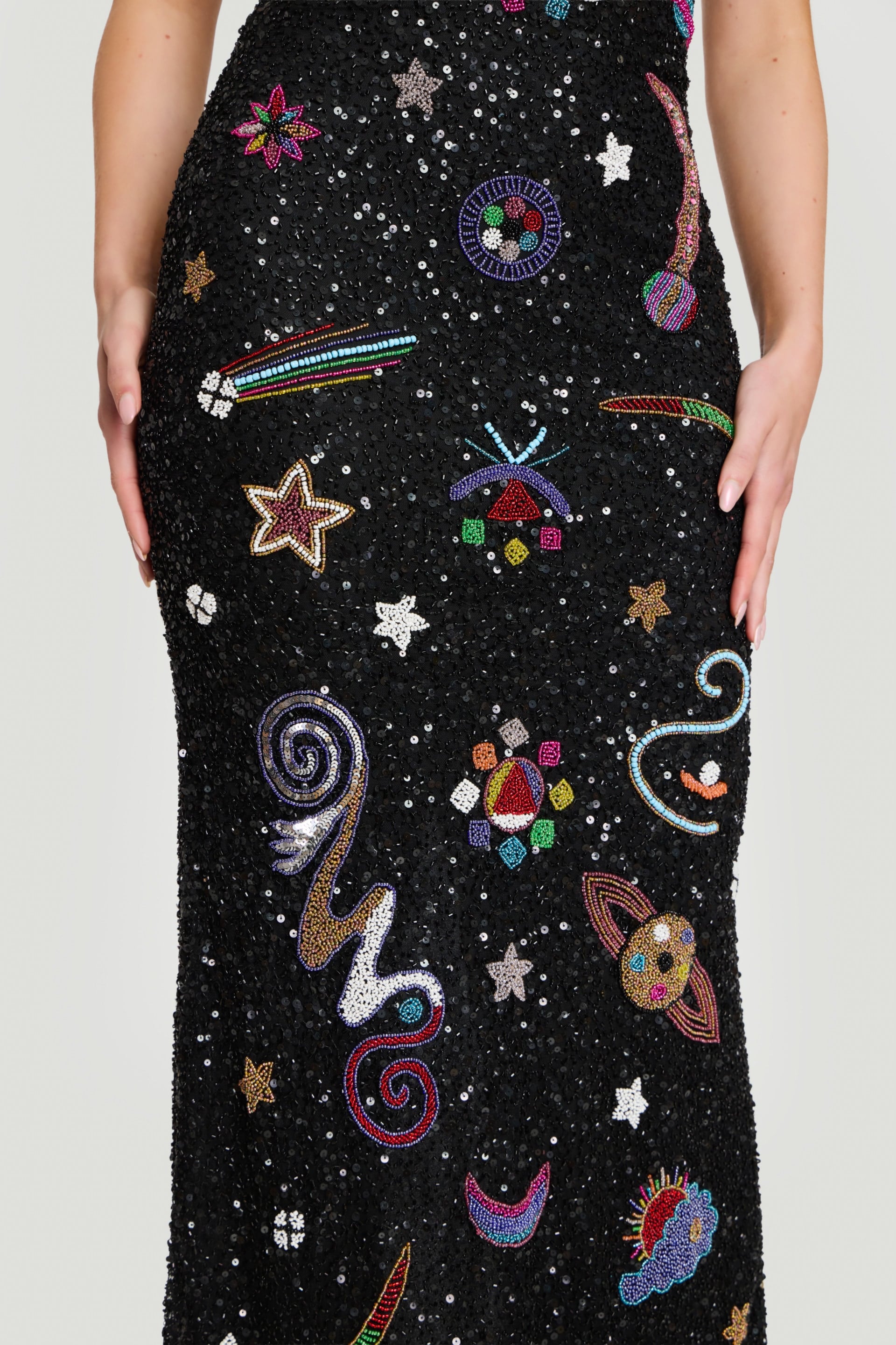 Multicolor space-themed beading, rhinestones, glitter accents, back slit