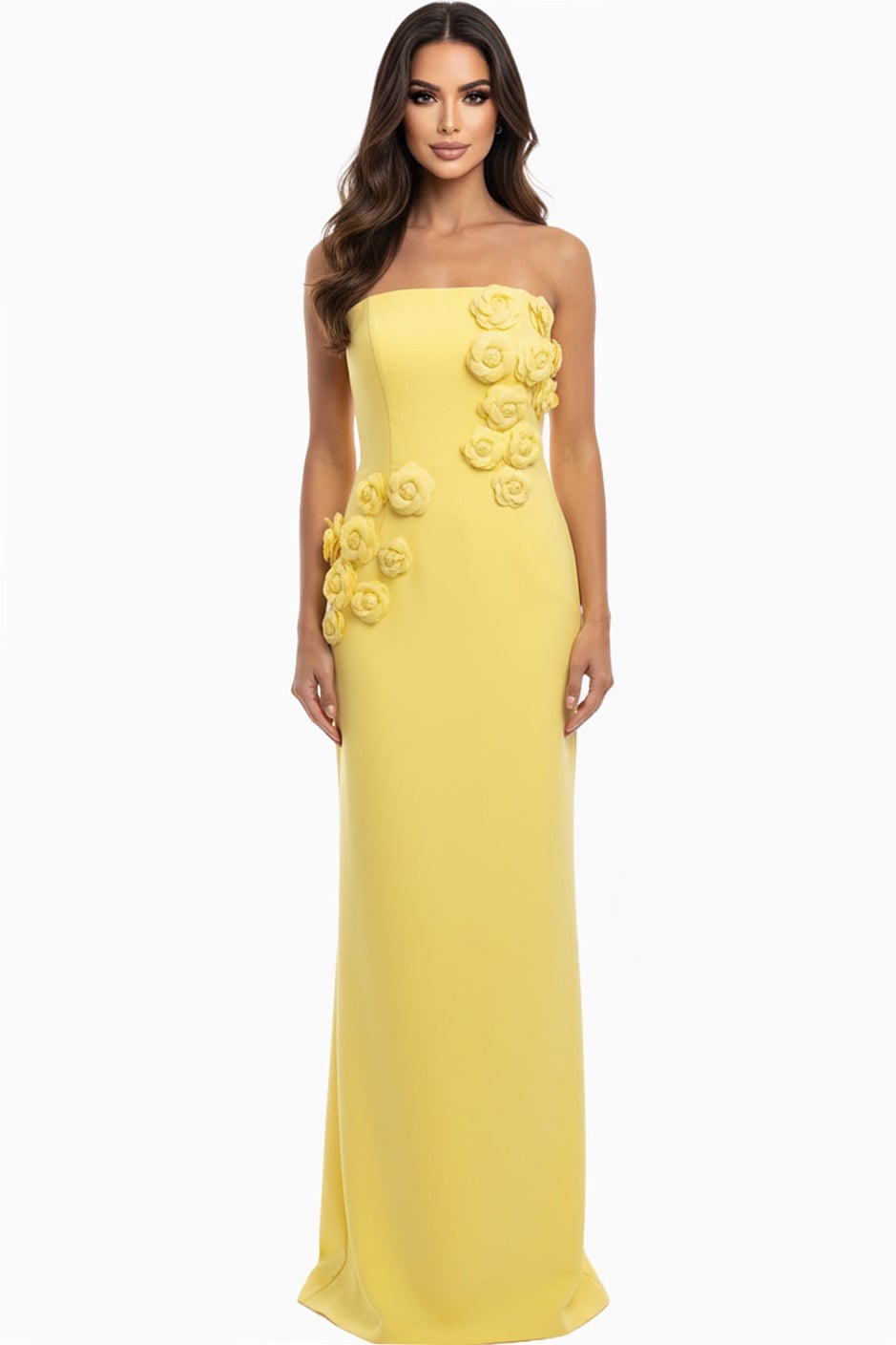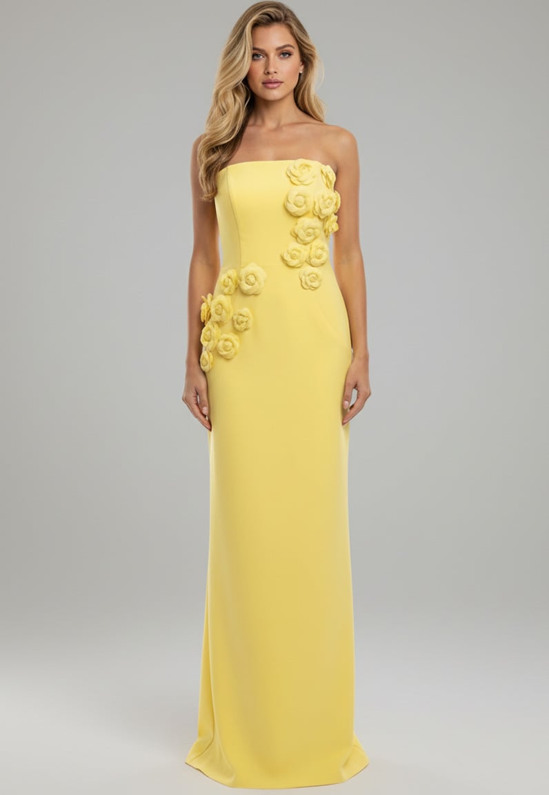 The Strapless Column Gown with Floral Appliqués 46884 features a sophisticated silhouette perfect for any formal occasion. This elegant gown, crafted from stretch crepe fabric, offers a smooth and flattering fit. The strapless straight neckline and sleeveless design are complemented by intricate 3D floral appliqués, adding a touch of femininity to its design. With a seamed bodice and floor-length hem, this gown ensures a graceful presence. The back reveals a straight style with a center zipper for a clean finish.