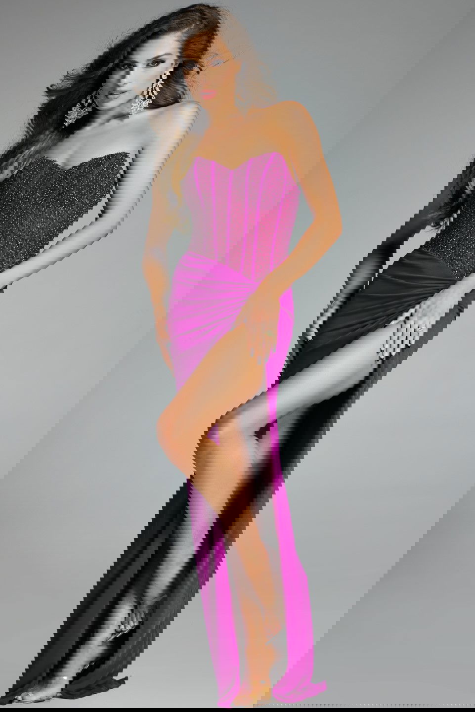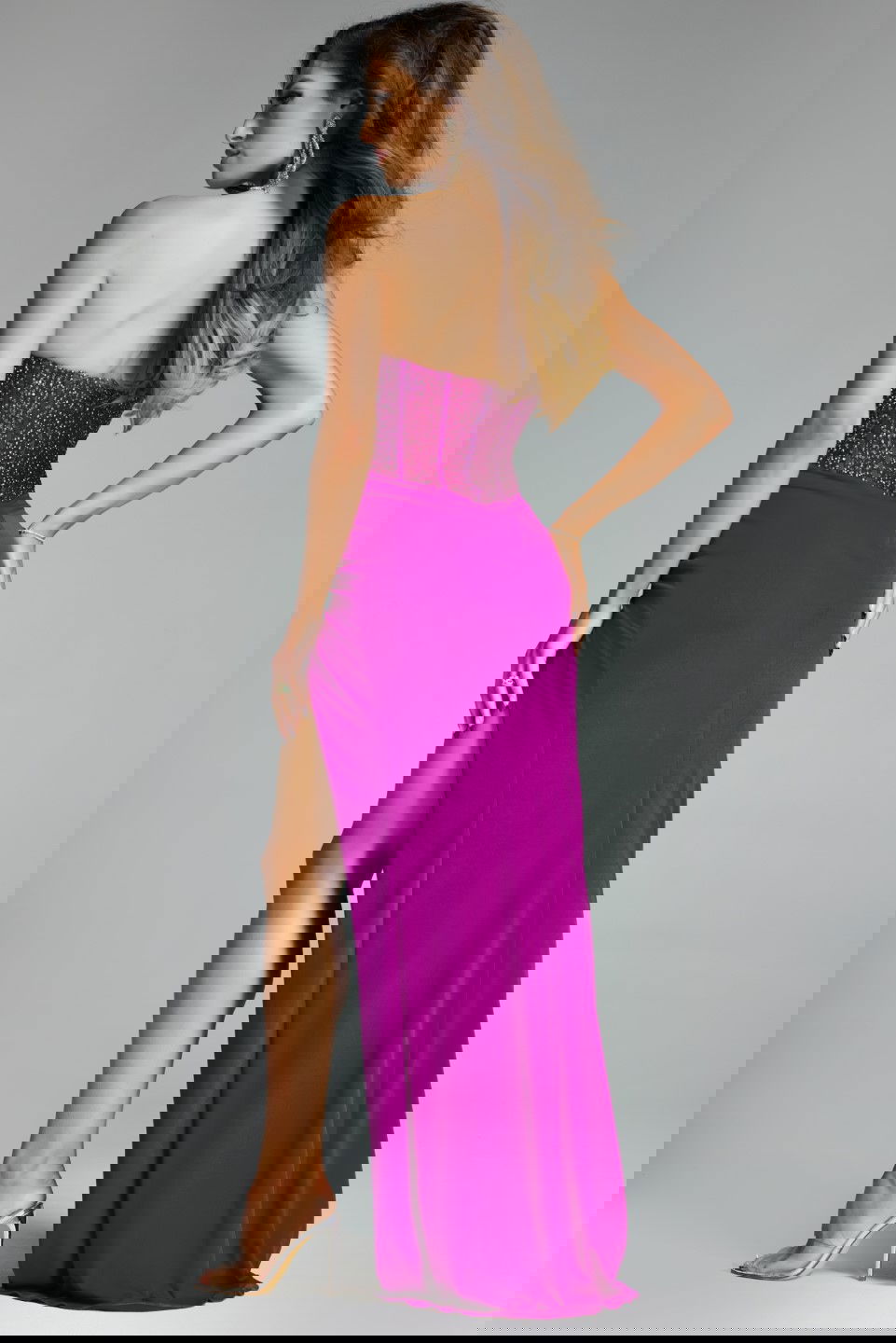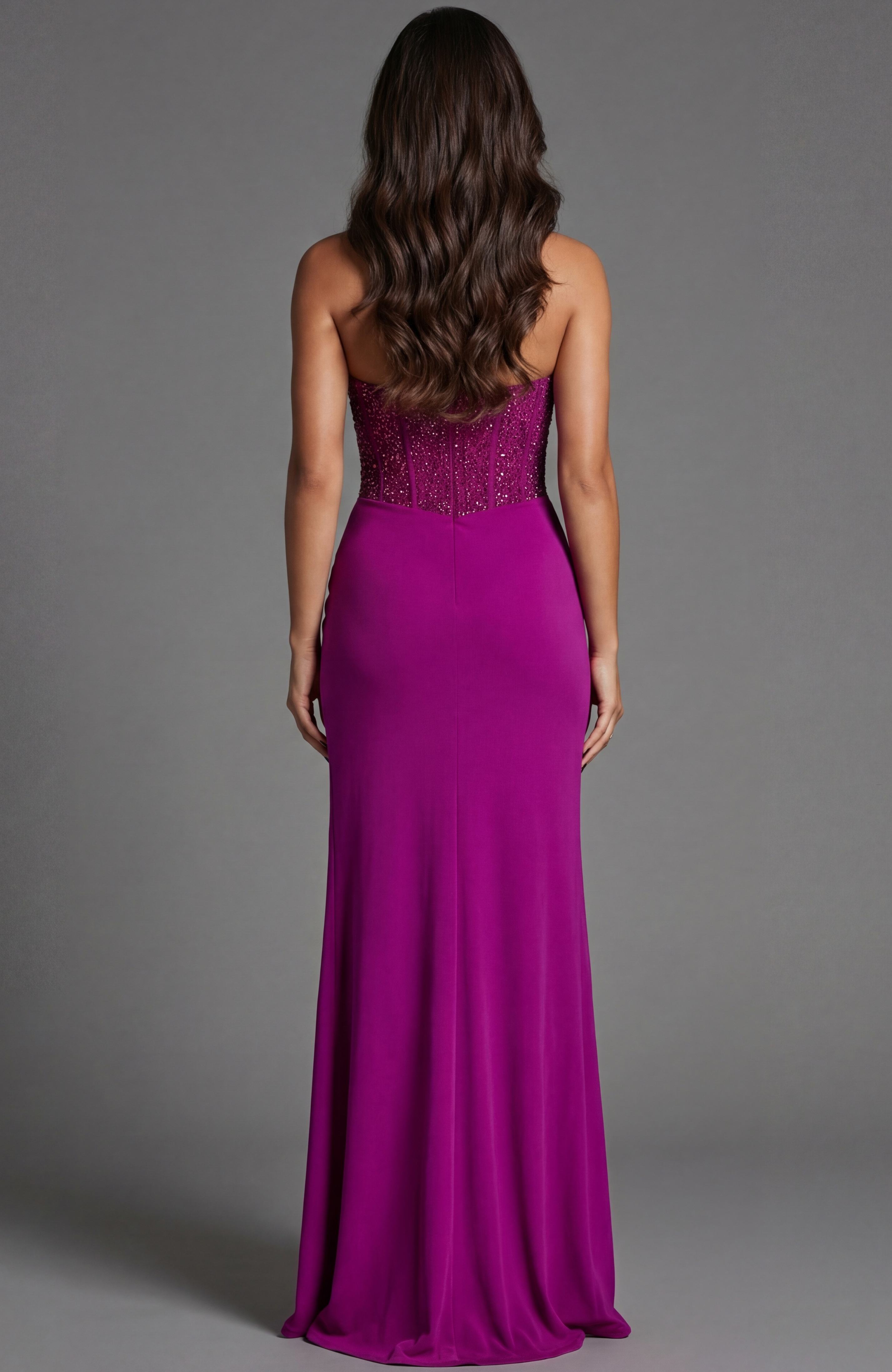 This stunning fuchsia evening gown offers a captivating allure with its elegant full-length design. The dress features a fitted silhouette that accentuates the bodice and hips, while a daring high slit adds a touch of drama and movement. The strapless neckline is beautifully embellished with intricate beading, adding a glamorous sparkle to the overall look. The soft, flowing fabric elegantly drapes to the floor-length hem, creating a sophisticated and eye-catching ensemble perfect for any formal occasion.