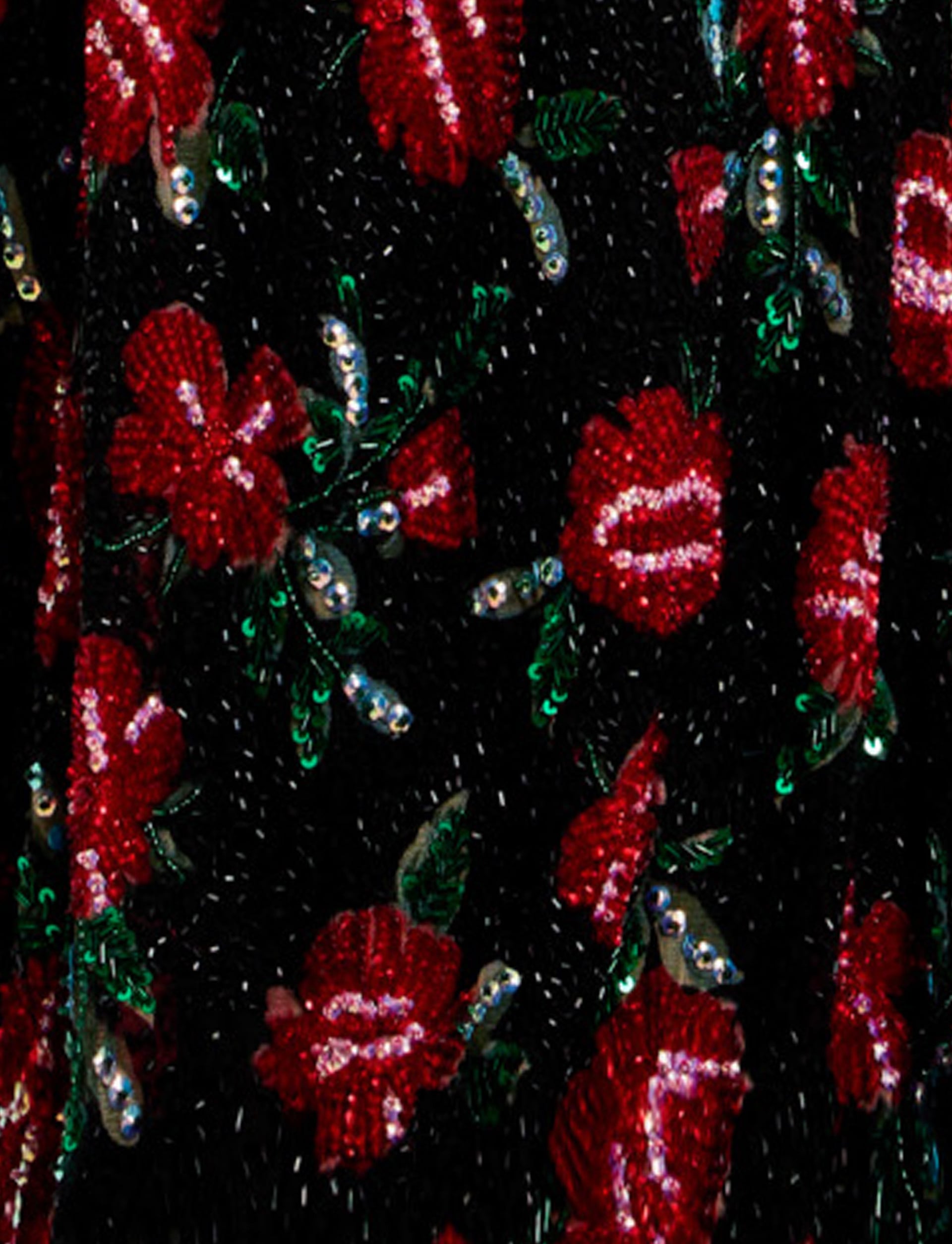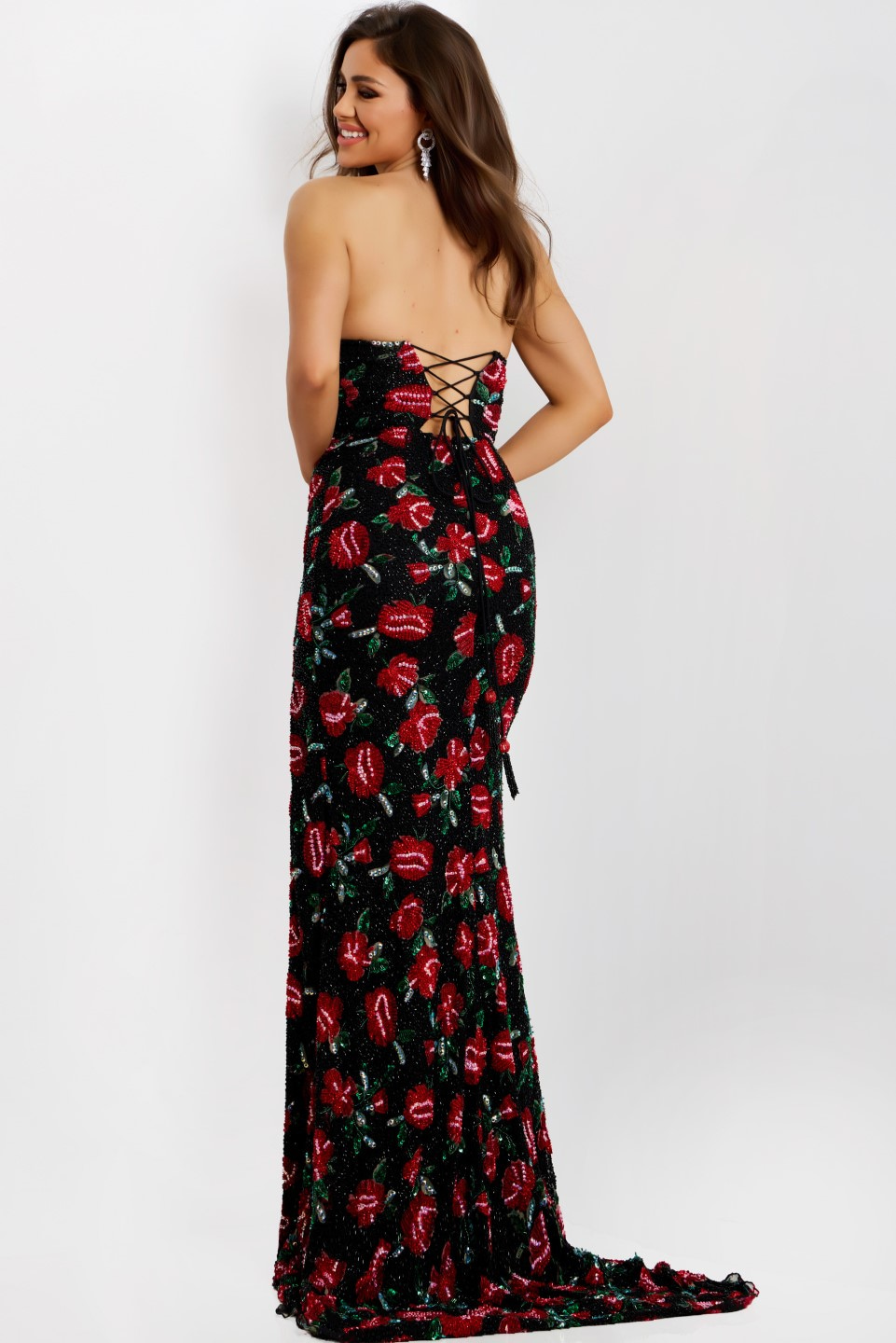 This captivating full-length gown features a strapless neckline that gracefully highlights the shoulders. The fitted silhouette is adorned with intricate, vibrant embellishments that add a touch of glamour. A daring high slit brings allure and movement to the design, while the lace-up back provides a customizable fit, ensuring comfort and style. The dress concludes with a graceful train, adding an element of drama to your entrance.