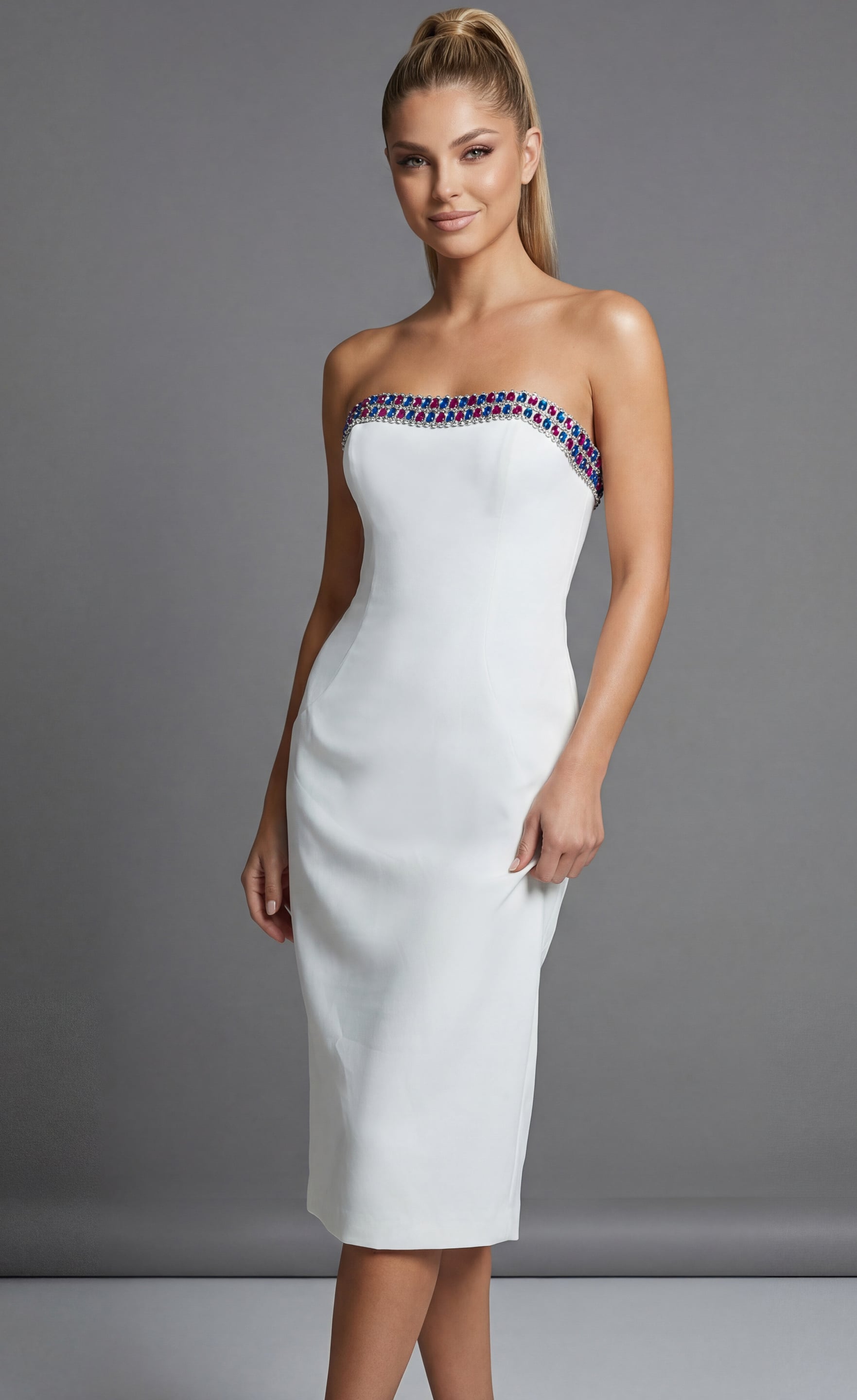 Strapless Fitted Midi Dress with Crystal Trim 44894