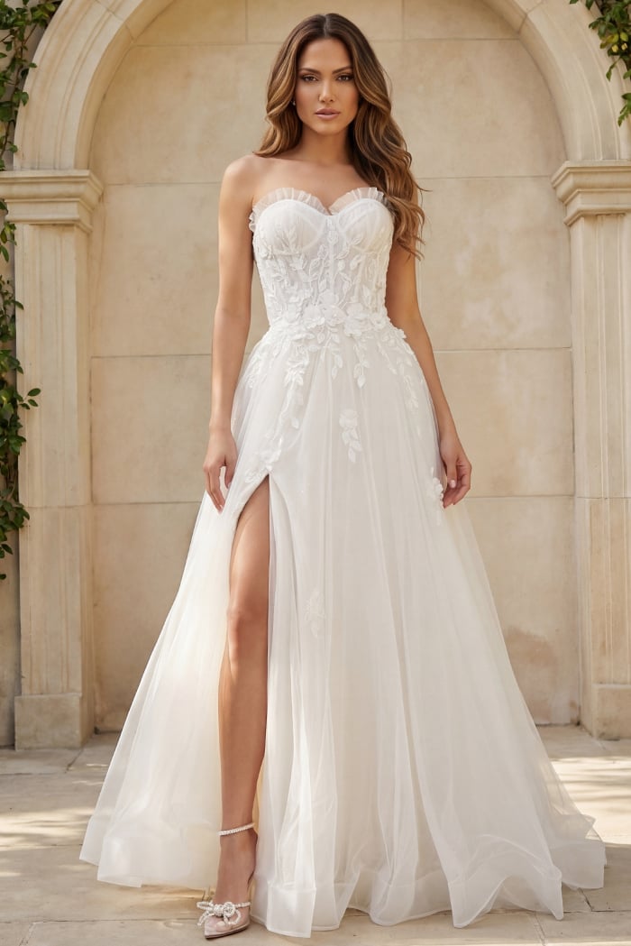 Strapless Floral A-Line Wedding Gown with Slit JB42485. Embrace elegance and sophistication with this stunning gown featuring a delicate floral design, luxurious tulle fabric, and a flirtatious high slit. The sleeveless, strapless neckline provides a timeless silhouette, while the A-line shape ensures a flattering fit for any bride. This exquisite gown is perfect for making an unforgettable entrance on your special day.