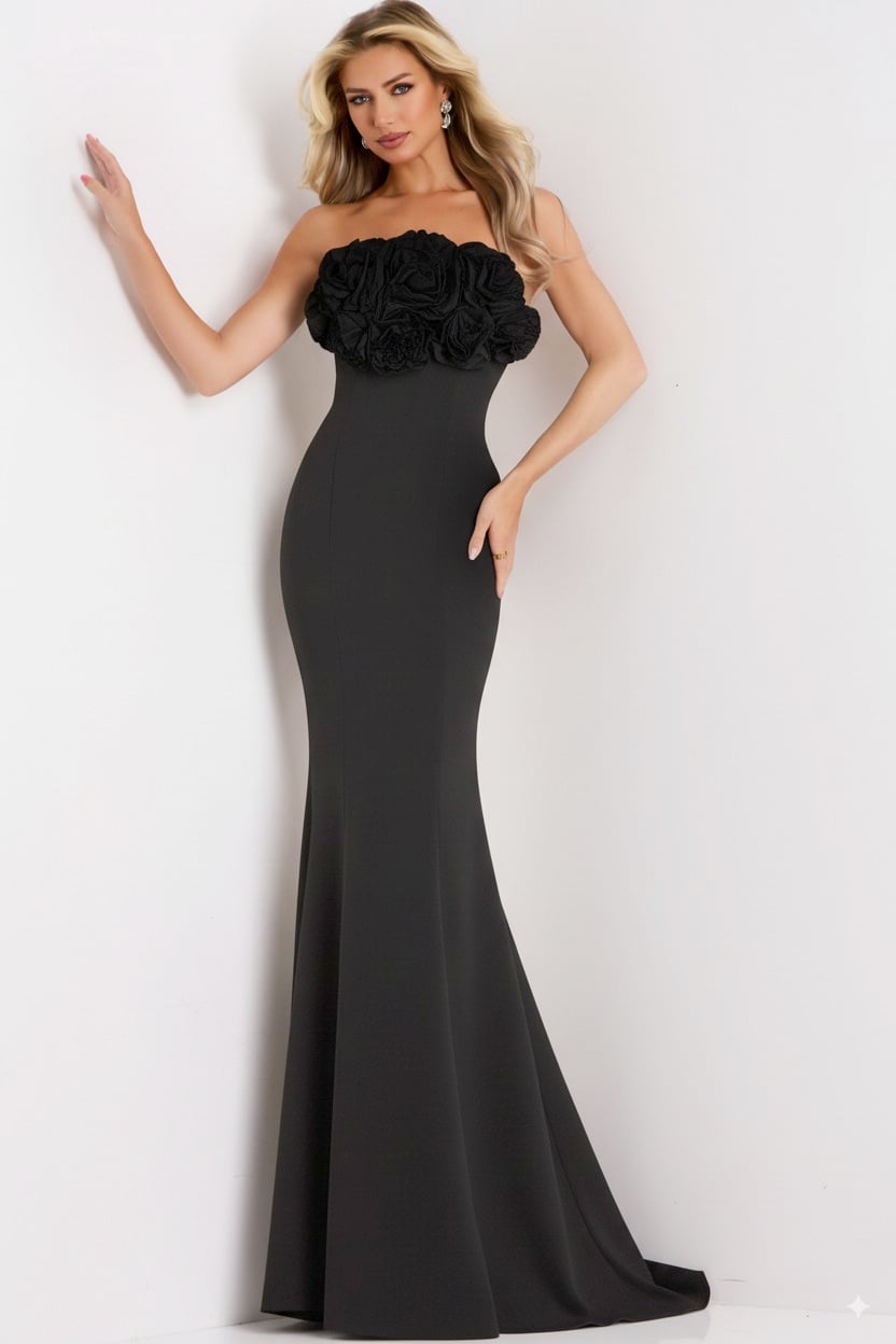 Elevate your evening style with this strapless gown featuring exquisite floral appliques across the bodice. The elegant floor-length design is tailored with a figure-hugging silhouette, leading into a graceful sweep train. Perfectly designed to make a statement, the gown is sleeveless and offers a sophisticated, yet bold aesthetic. The back of the dress showcases a seamless fit that enhances its overall allure.