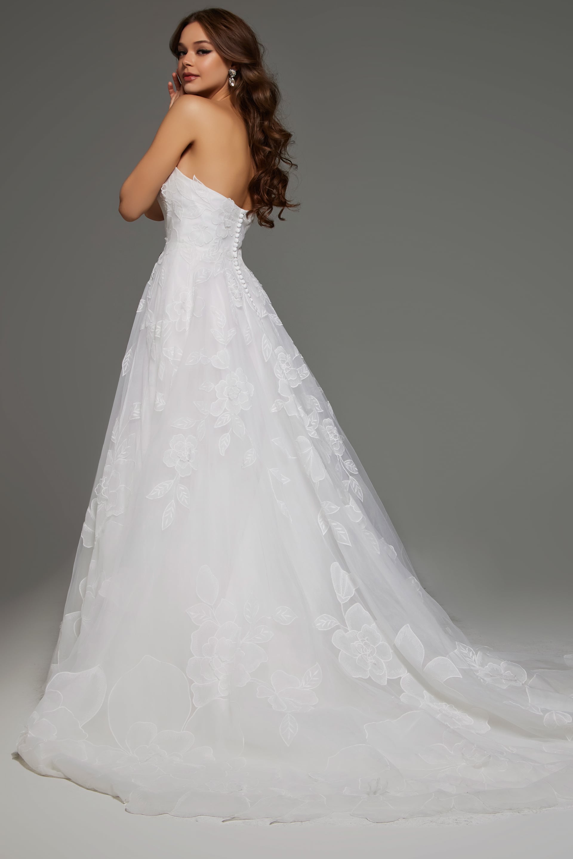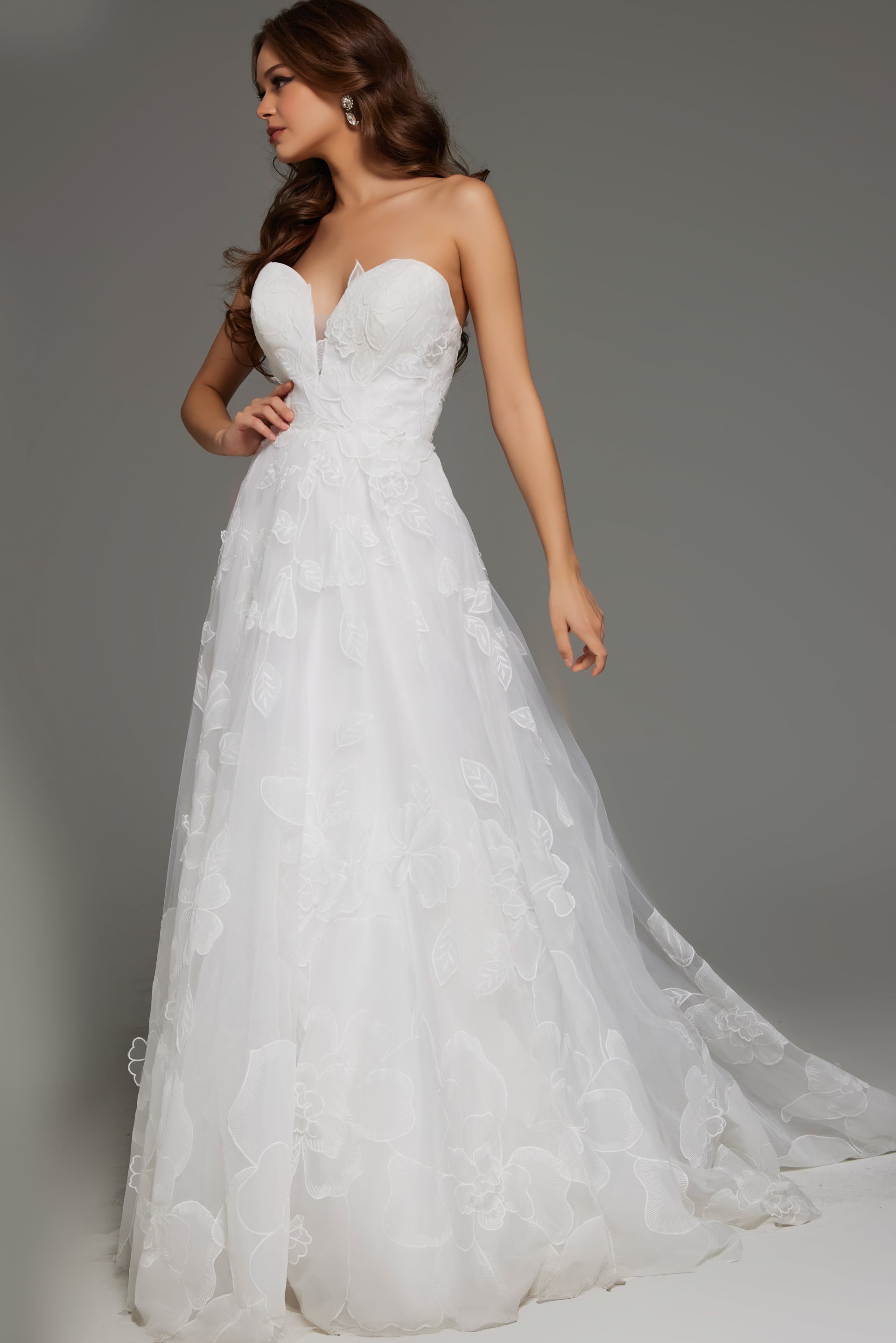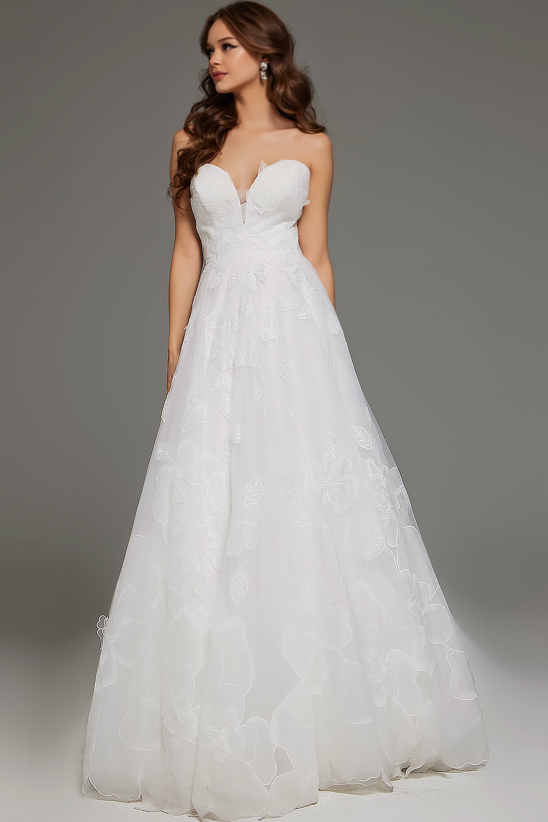 Strapless Floral Applique Wedding Dress with Sweetheart Neckline JB42324. This breathtaking wedding gown features a stunning sweetheart neckline paired with an elegant strapless bodice. The dress is adorned with exquisite floral applique detailing that cascades down the luxurious tulle fabric, giving it a romantic and ethereal feel. The A-line silhouette is designed to flatter your figure, while the floor-length skirt adds a touch of grandeur. Perfect for the modern bride, this dress combines classic elegance with contemporary style.