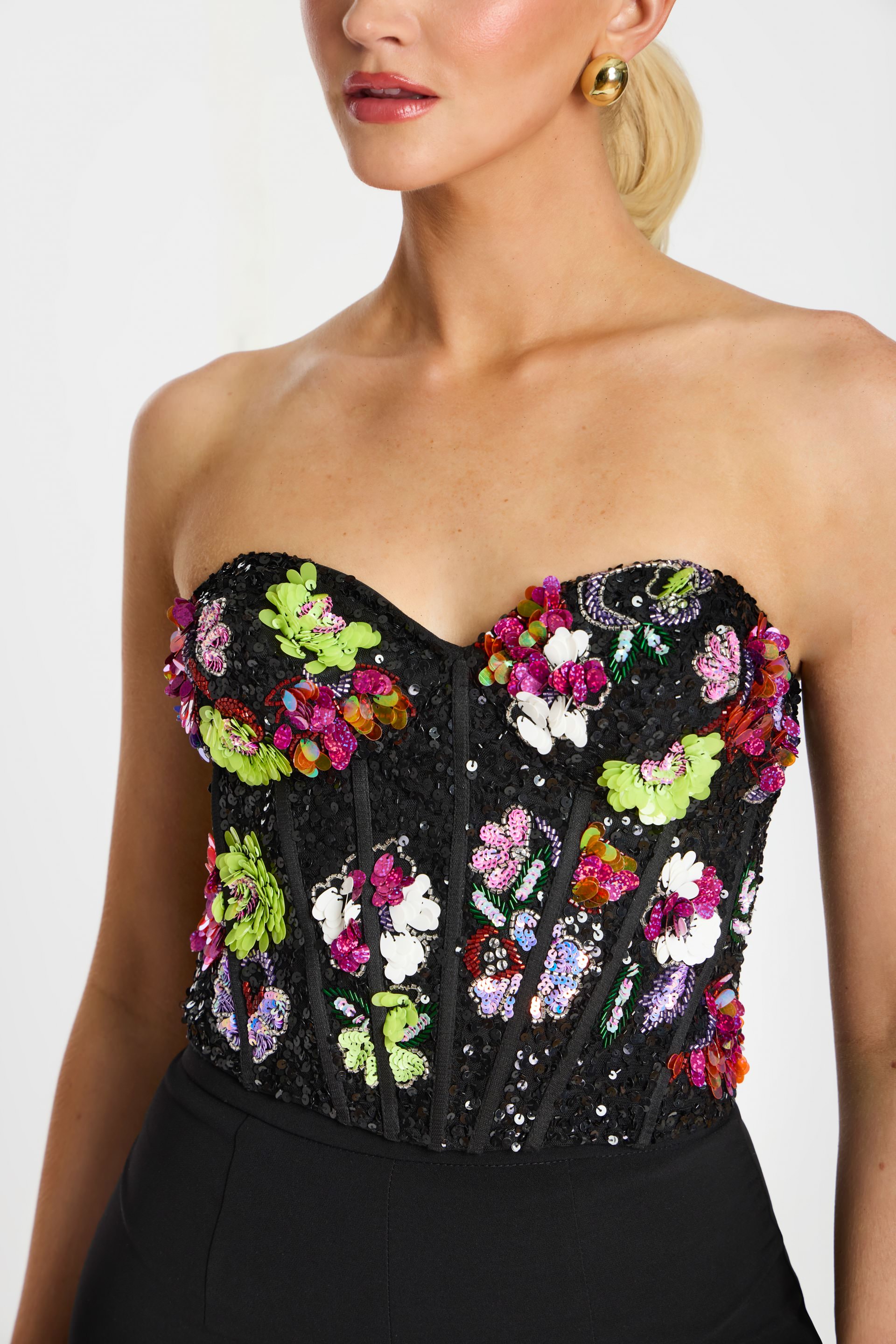 Strapless Floral Beaded Corset Top in Black Sequin Mesh 45245