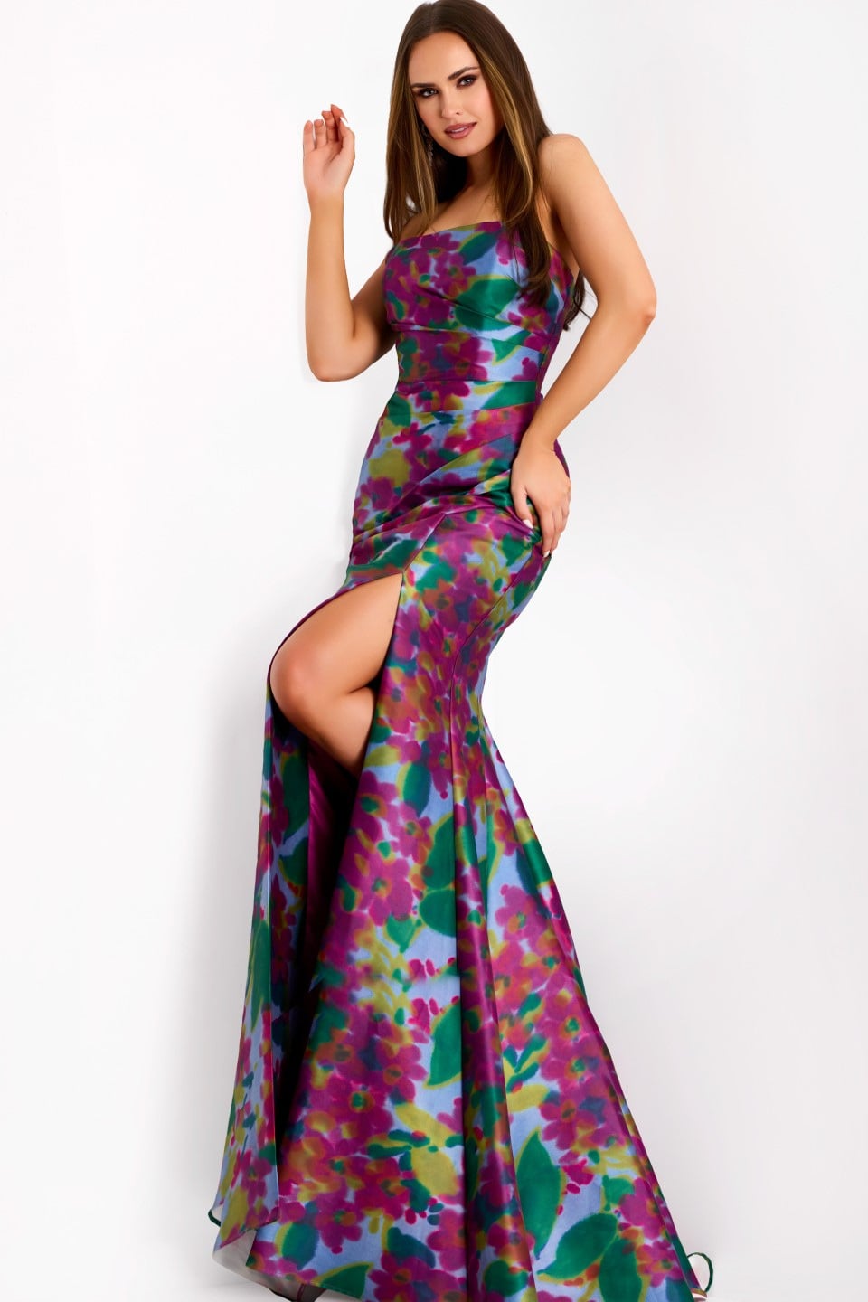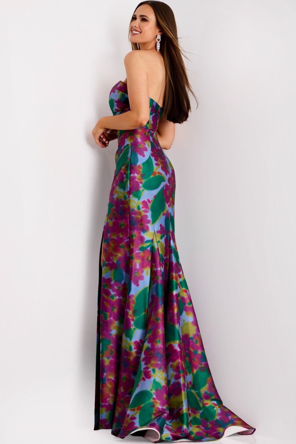 This stunning full-length gown showcases a glamorous strapless design and a sleek fitted silhouette. The bold floral pattern adds charm, while the high side slit introduces an alluring touch, perfect for making a statement at any formal event.