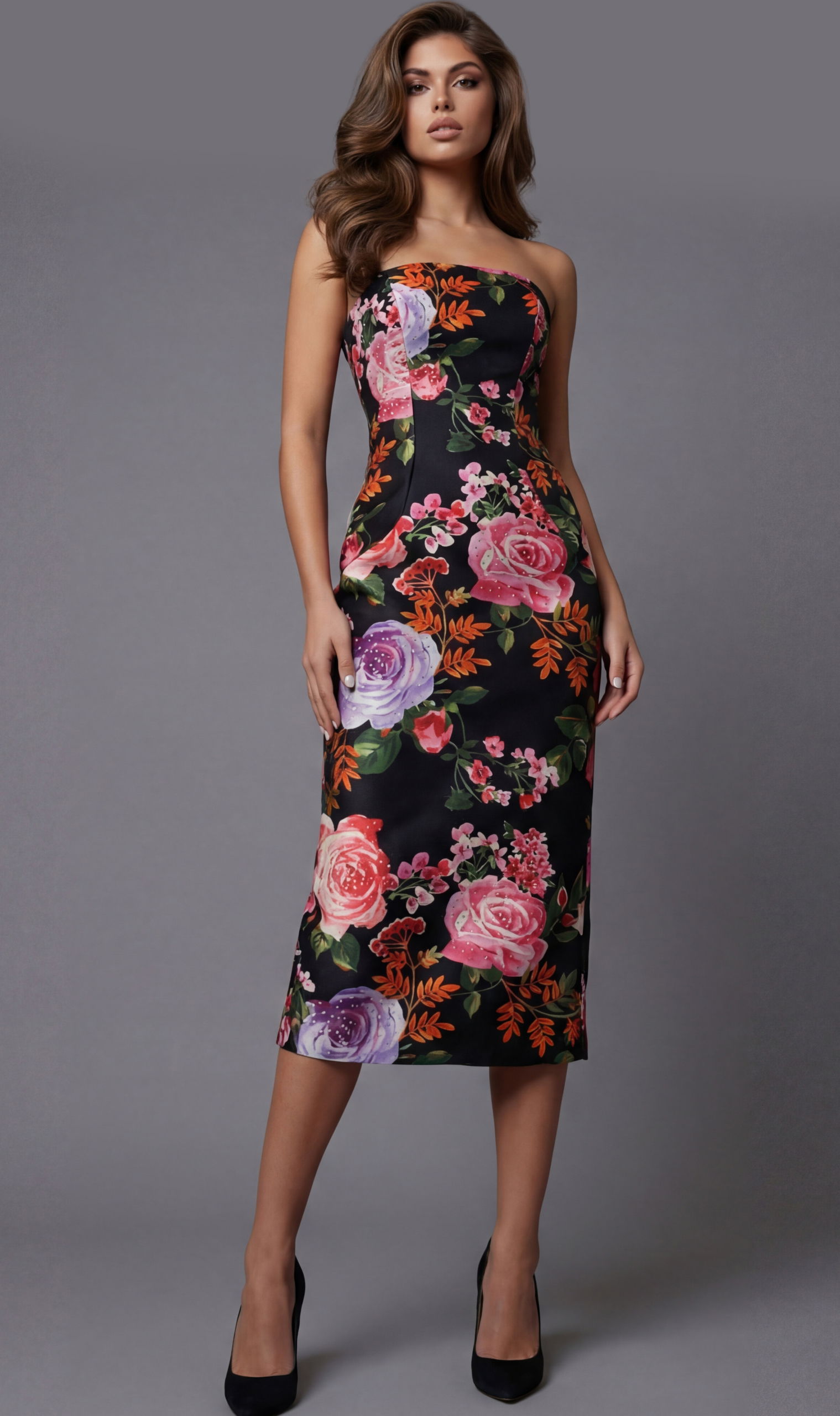 Strapless Floral Midi Dress With Fitted Silhouette 46565