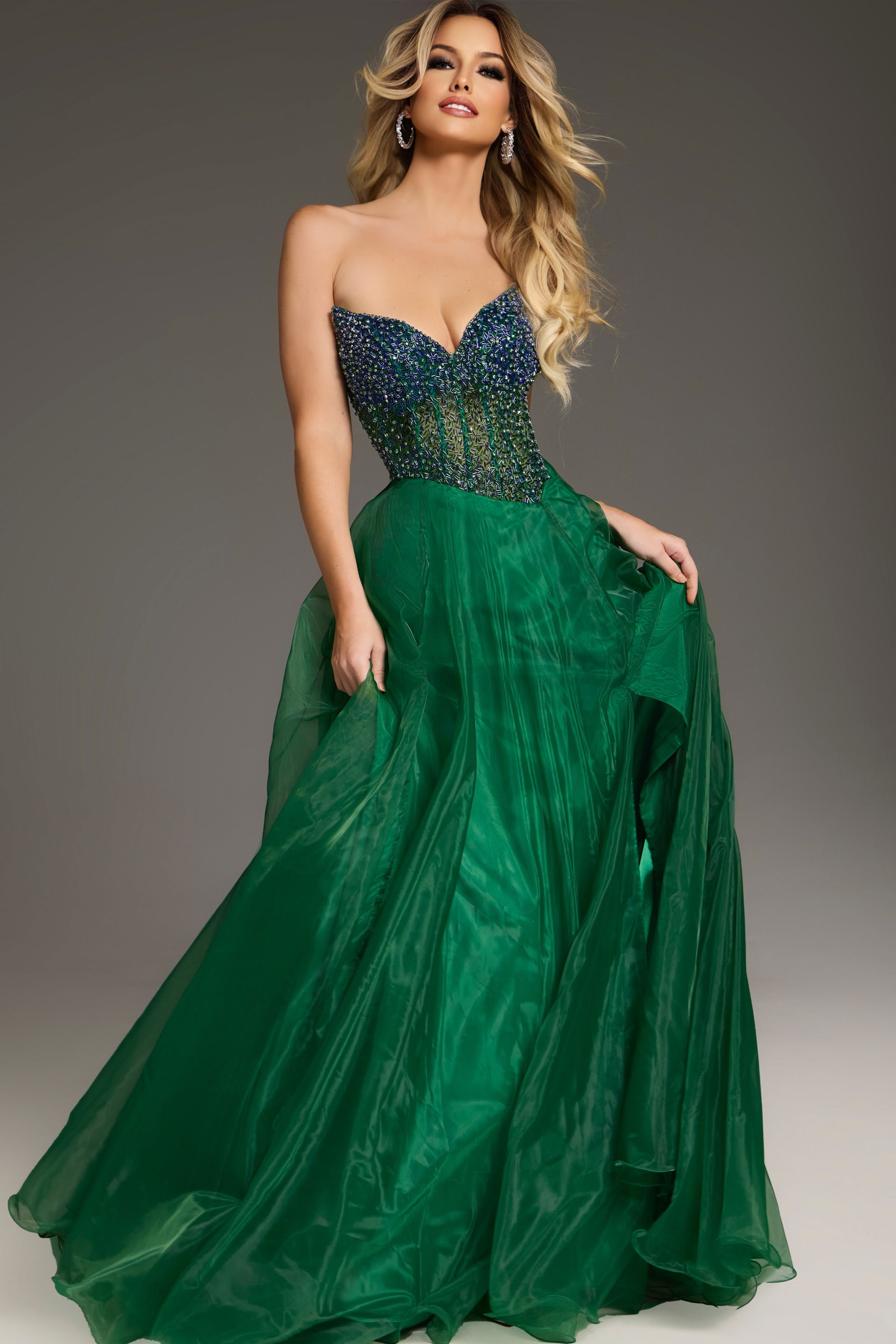 This enchanting green dress features a voluminous, floor-length silhouette that exudes elegance. The sweetheart neckline enhances its romantic appeal, while the bodice is adorned with intricate beadwork for an added touch of glamour. The dress is sleeveless, allowing for a graceful and airy feel. Its fitted bodice flares into a luxurious skirt, capturing a timeless essence perfect for any formal occasion.