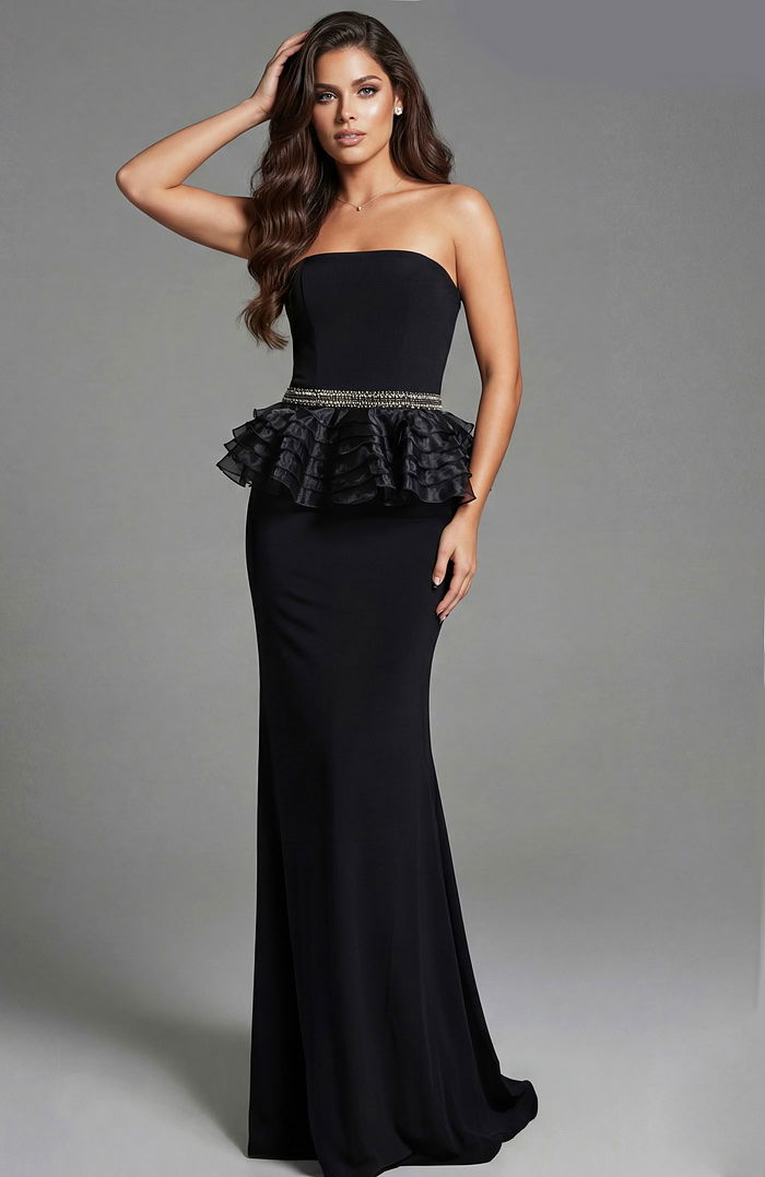 Strapless Gown with Ruffled Peplum and Beaded Waist 44382
