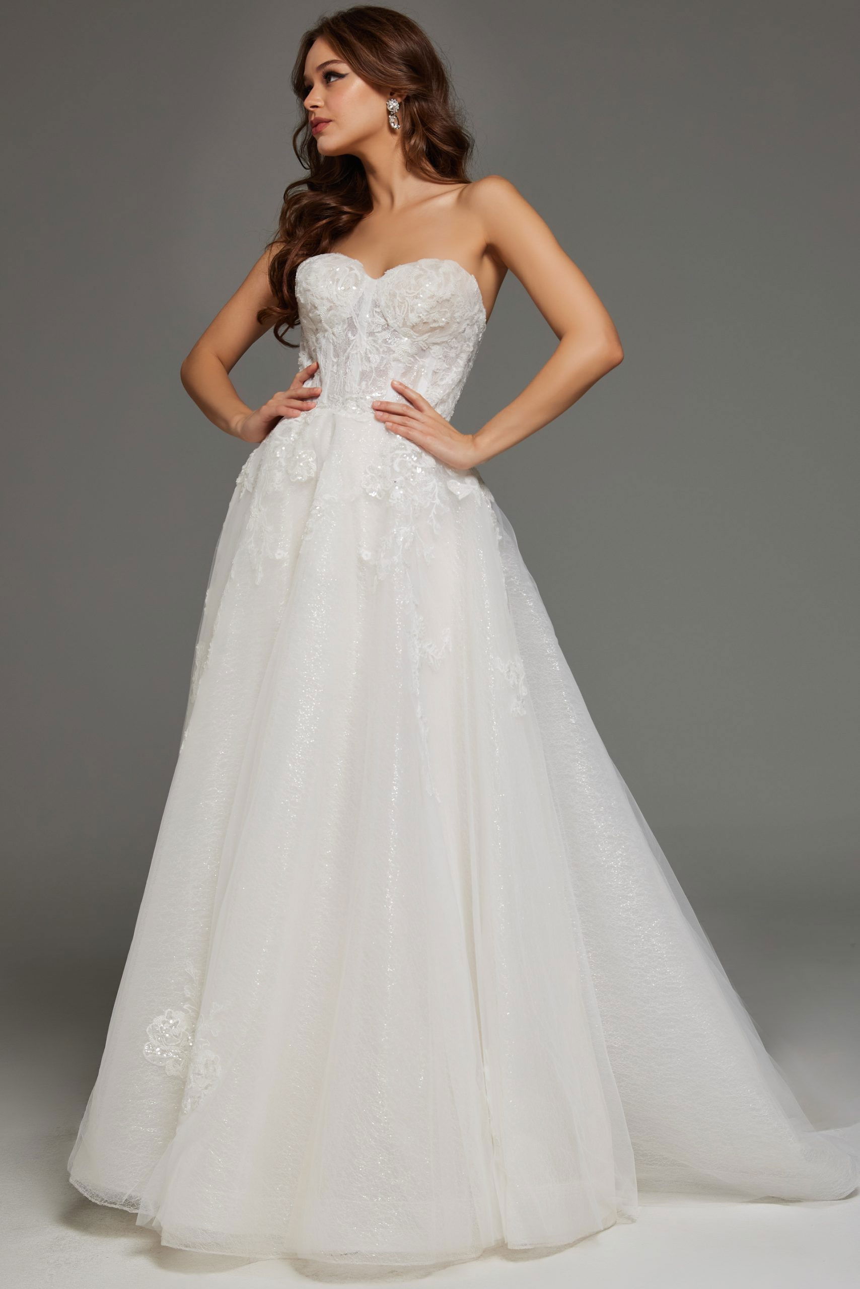 Strapless Lace Ball Gown with Embroidered Floral Appliqués JB43324. This stunning bridal gown features a luxurious combination of tulle and intricate lace fabric, creating a timeless elegance. The ballgown silhouette and floor-length design ensure a breathtaking entrance, while the strapless sweetheart neckline exudes a romantic charm. Adorned with delicate embroidered floral appliqués and beaded details, this dress offers a touch of opulence and sophistication. The open back style adds a modern twist to this classic gown, perfect for any memorable occasion.