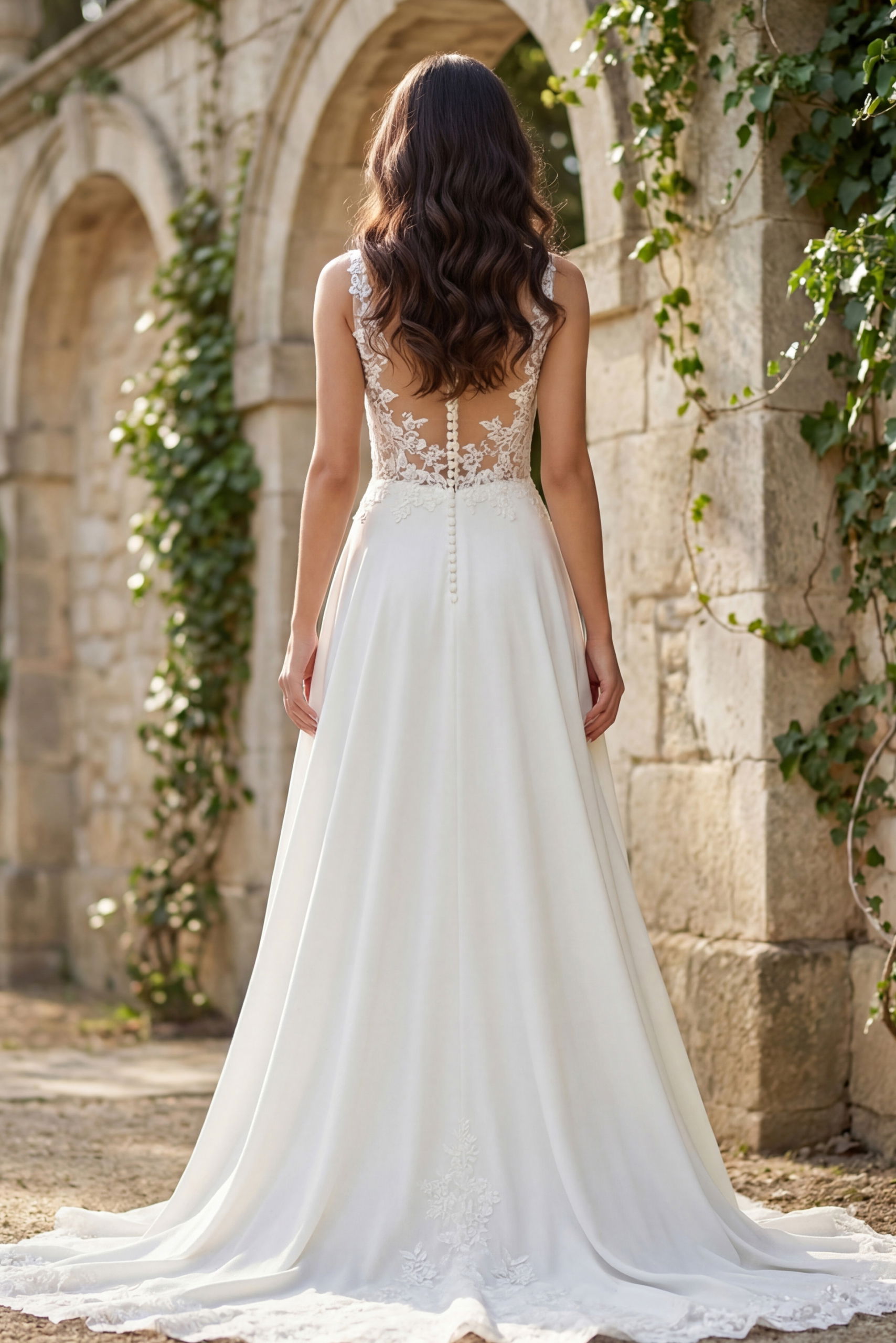 This enchanting ivory gown features an A-line silhouette with a full skirt that flows gracefully to the floor. The dress boasts a deep V-neckline and delicate lace back with intricate floral embroidery, adding an element of romantic allure. The sleeveless design accentuates a fitted bodice that flatters the figure. The dress finishes with a subtle train, enhancing its timeless elegance.