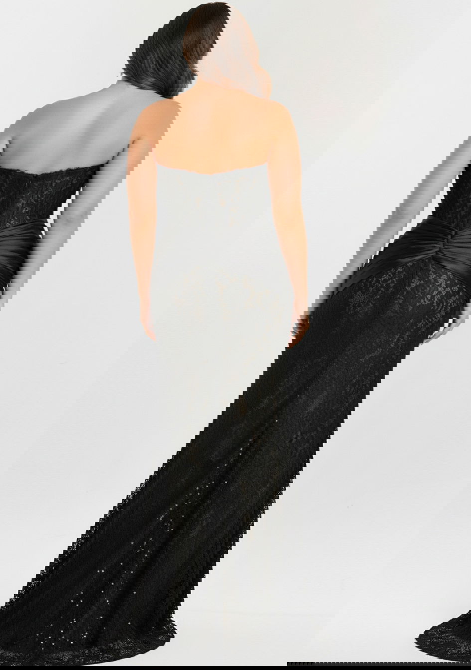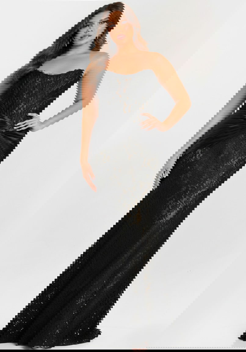 This exquisite gown features a full-length, figure-flattering silhouette with a vibrant lace overlay. The strapless neckline is elegantly scalloped, adding a touch of romance to the design. A draped satin detail accentuates the waist, creating a stunning look from every angle. Perfect for formal occasions, this gown combines classic elegance with modern sophistication.
