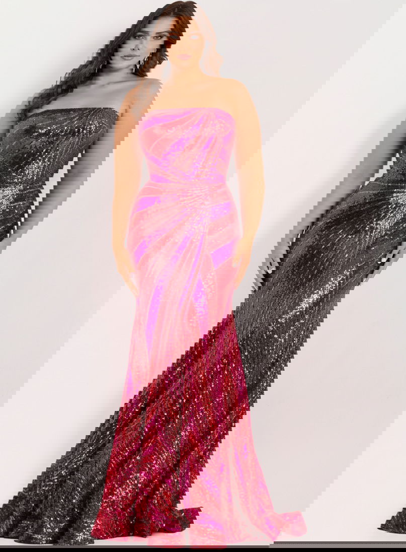 The Strapless Metallic Sequin Gown 40765 is an exquisite choice for any glamorous event. This stunning gown features a strapless neckline, showcasing your elegance and poise. Designed with a fitted silhouette, it accentuates your curves beautifully. The fabric is adorned with dazzling sequins, creating a mesmerizing metallic effect that catches the light. The dress flows gracefully to a floor length, perfect for making a grand entrance. Ideal for special occasions, this gown embodies sophistication and allure.