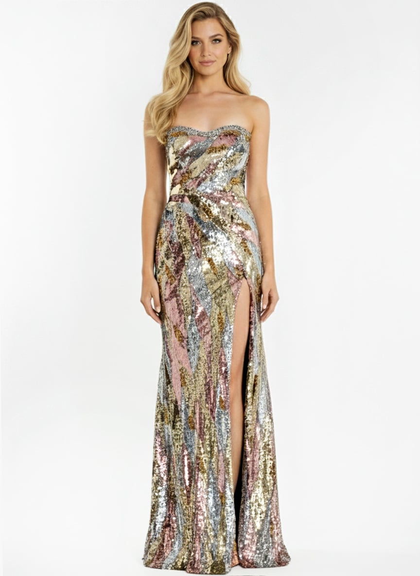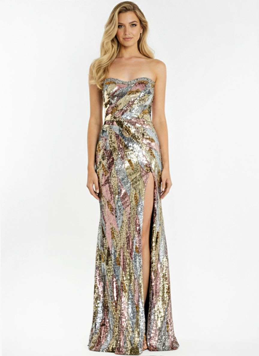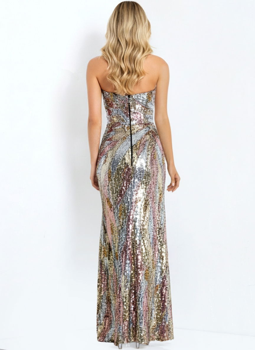 Strapless Multicolor Sequin Gown with Side Slit 48550