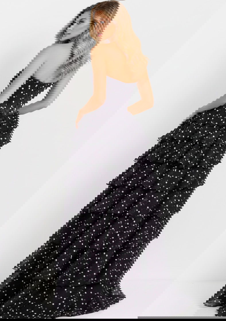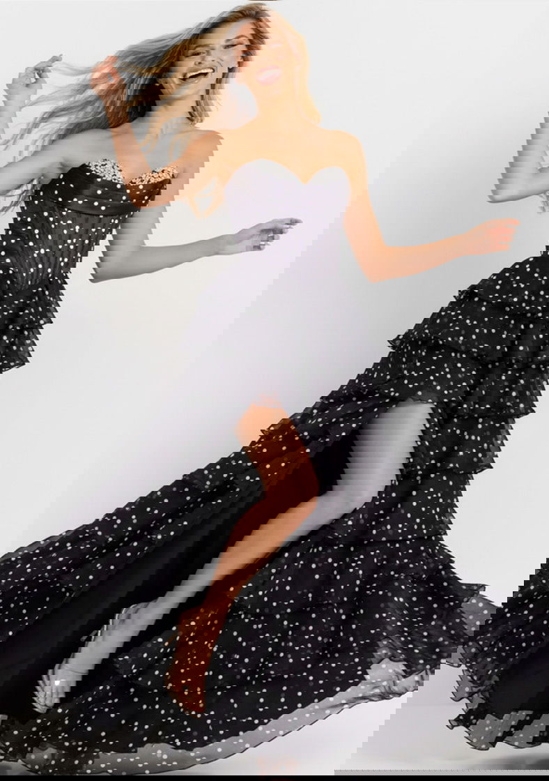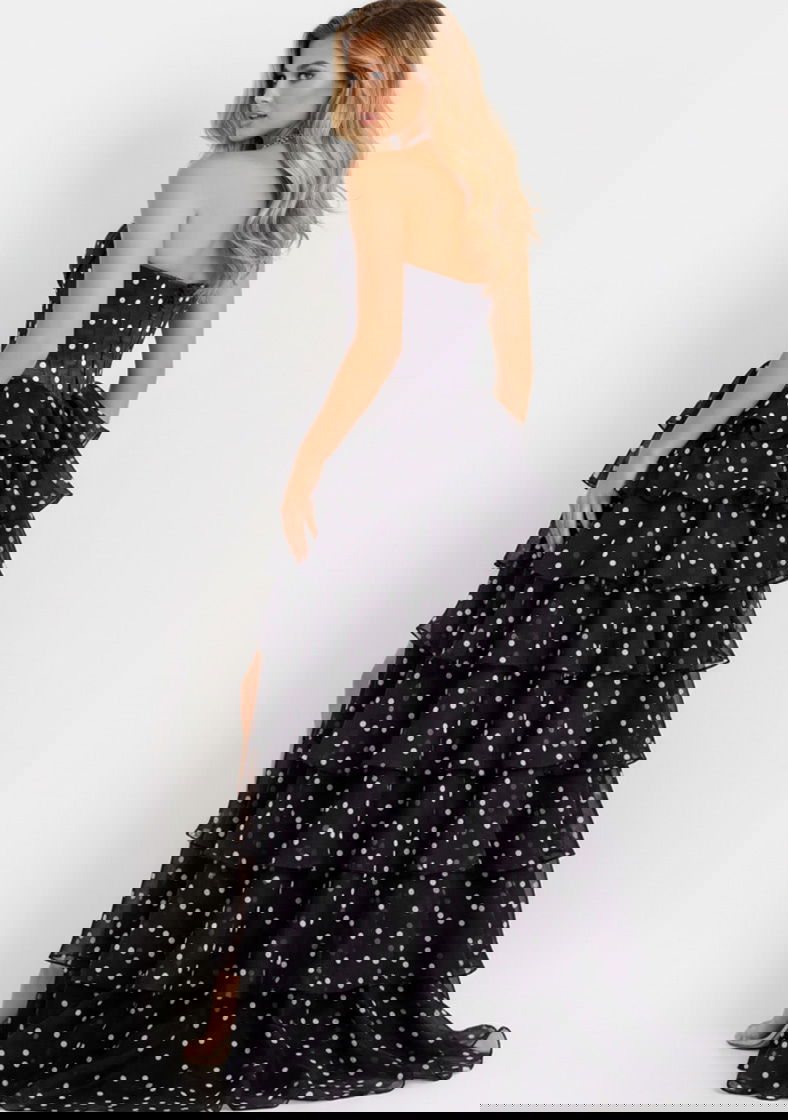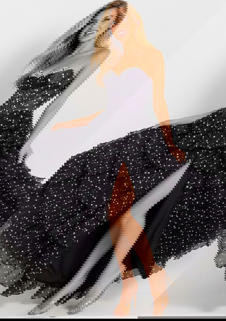 Layered ruffled skirt, high slit, corset-style bodice with boning, crystal trim on neckline
