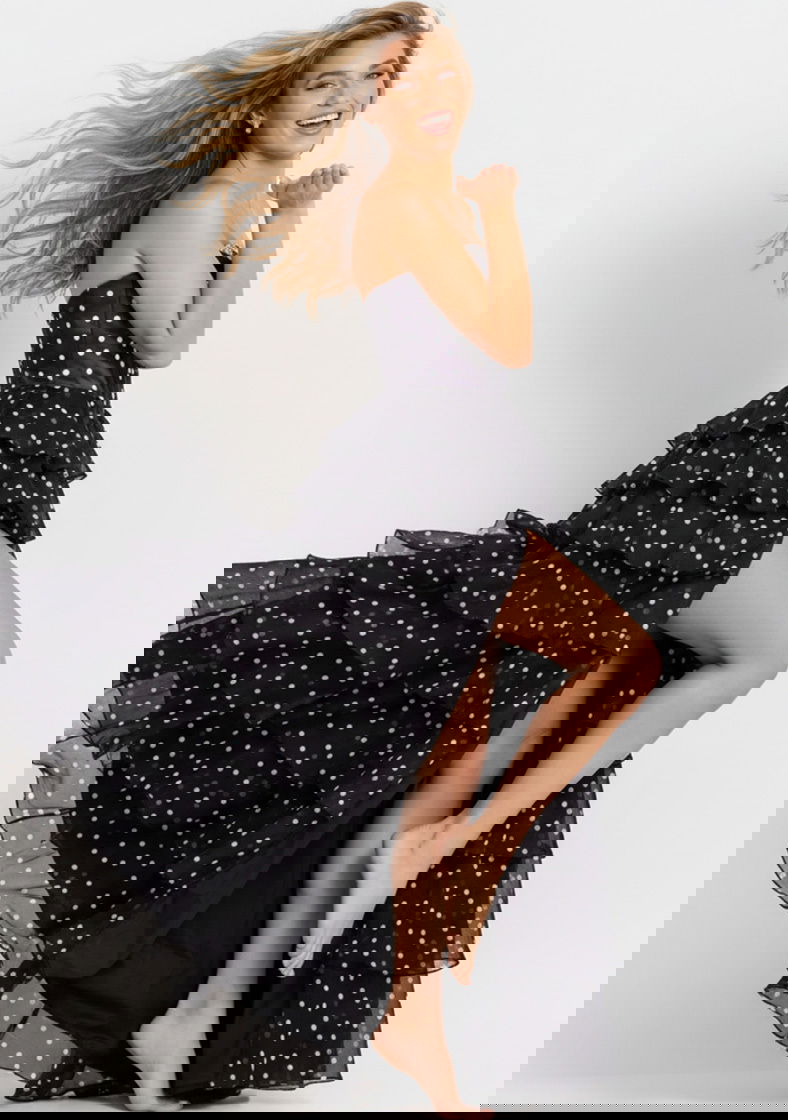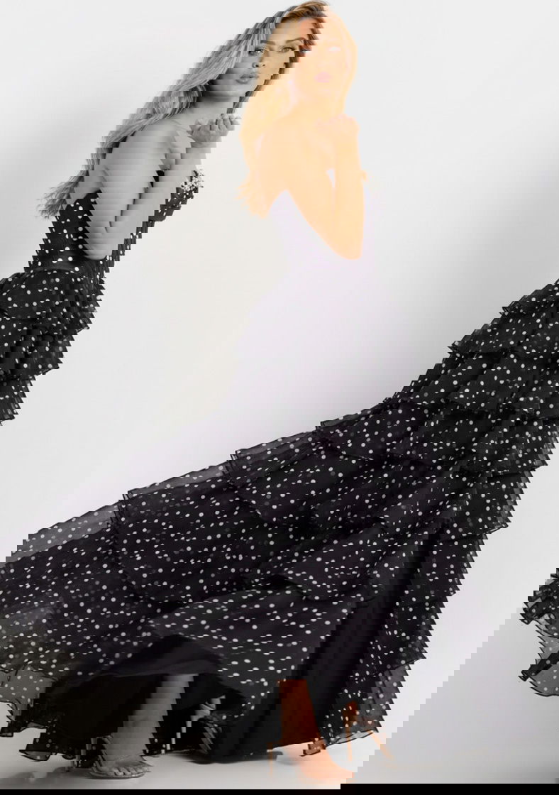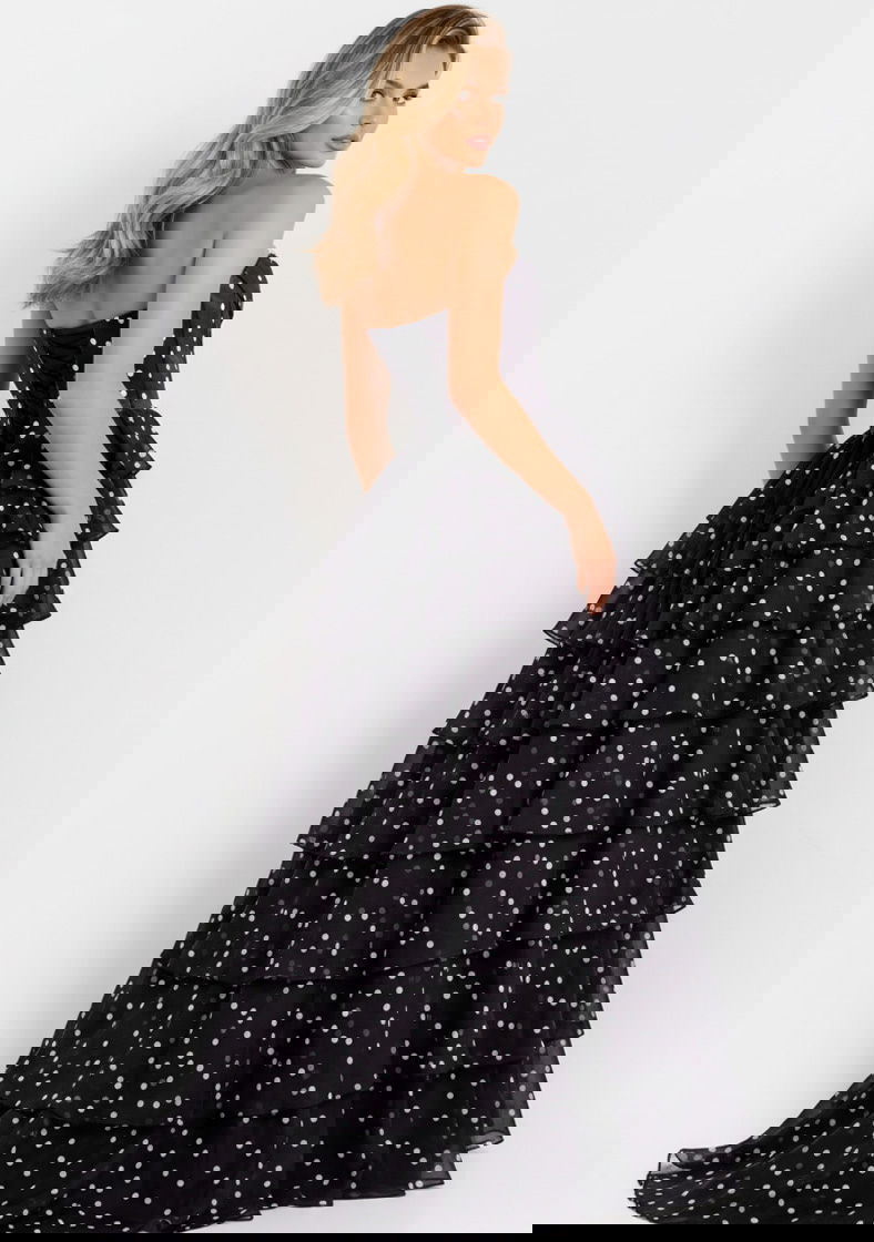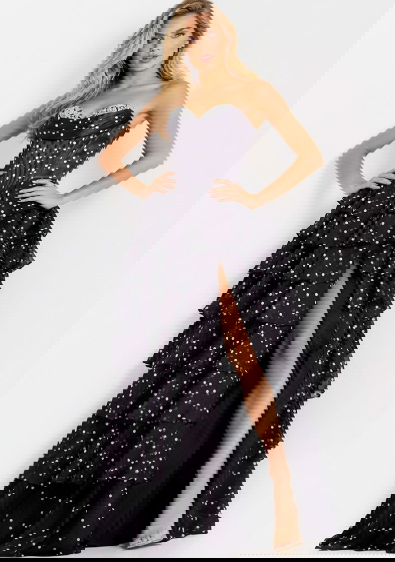 Layered ruffled skirt, high slit, corset-style bodice with boning, crystal trim on neckline