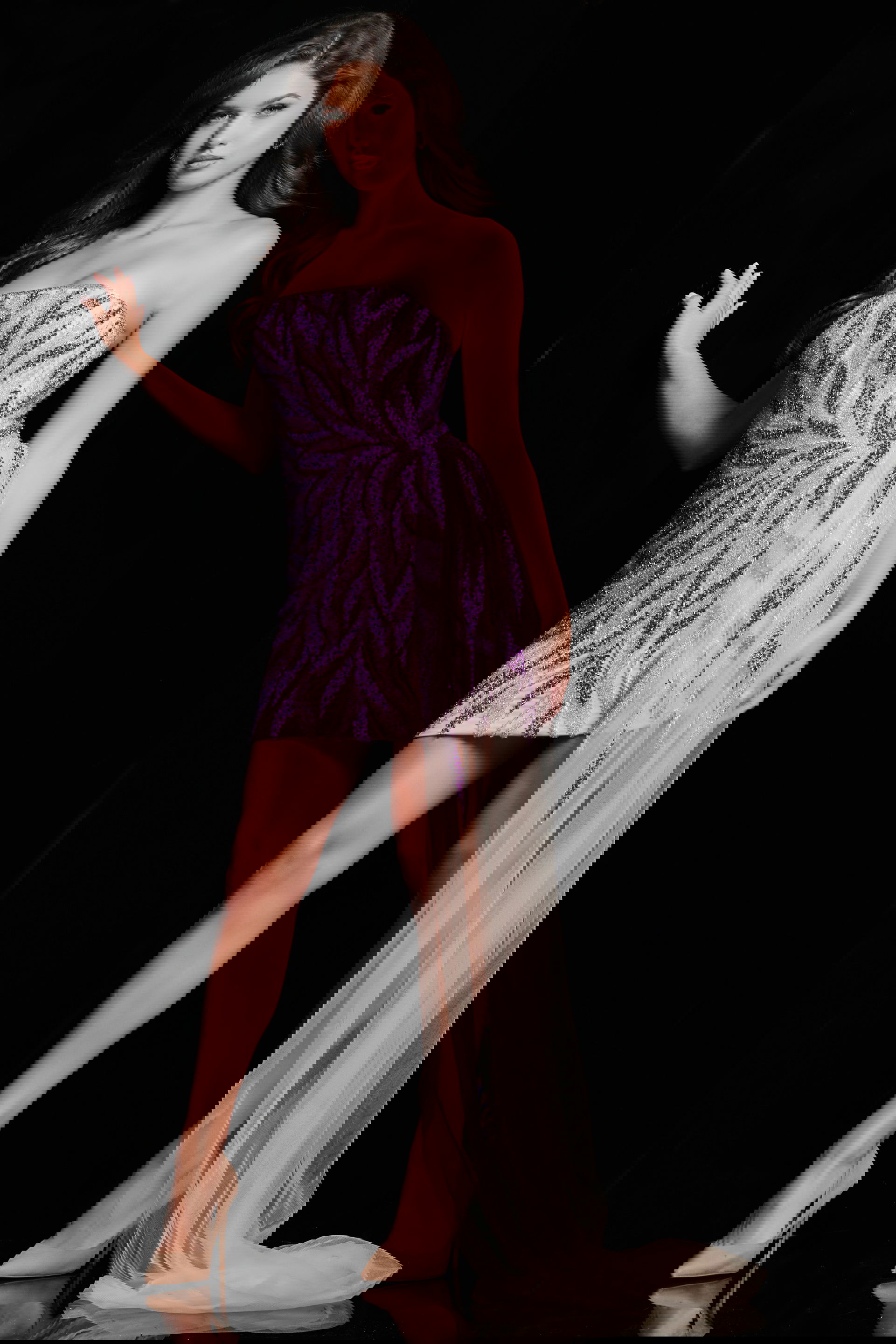 The Strapless Purple and Nude Embellished Short Dress 26274 is a vision of elegance and modernity. This dazzling piece features a splendid blend of sequins in a vibrant purple hue against a classic nude backdrop. The dress is designed in a sheath silhouette, accentuating the body’s natural curves and creating a flawless figure. The strapless neckline offers a contemporary and chic appearance, while the short length adds a dash of flirty appeal. Made from premium sheer fabric, it enhances its sophisticated and ethereal look. Perfect for evening events or parties, this dress is a must-have for those who want to make a lasting impression.