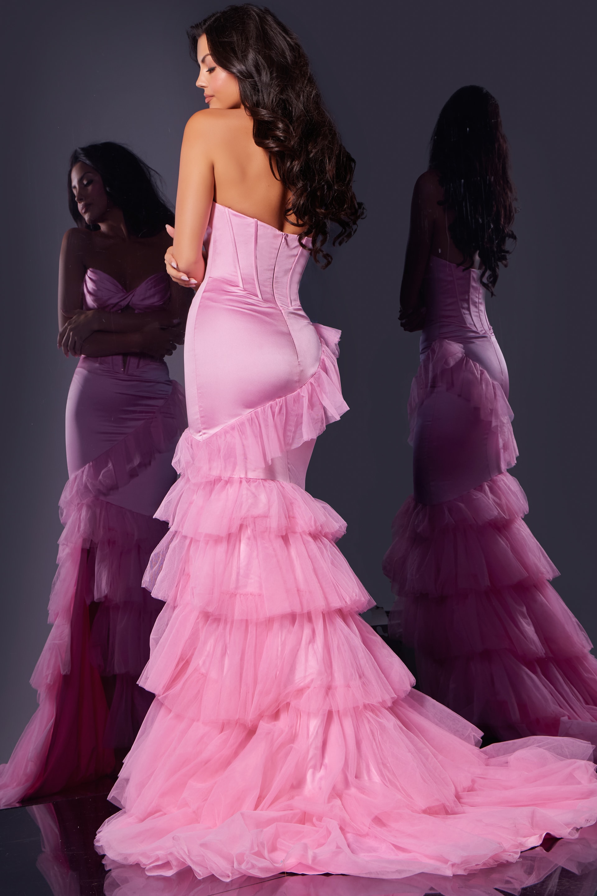 This exquisite pink dress features a captivating sweetheart neckline that beautifully complements the sleeveless bodice. Designed with an elegant mermaid silhouette, the dress hugs the figure through the bodice and hips, flaring out with layered ruffles cascading down to the floor. The gown includes a striking high slit, adding a touch of allure and modernity. The vibrant pink color and delicate fabric layers create a look of sophistication and romance, perfect for special occasions.