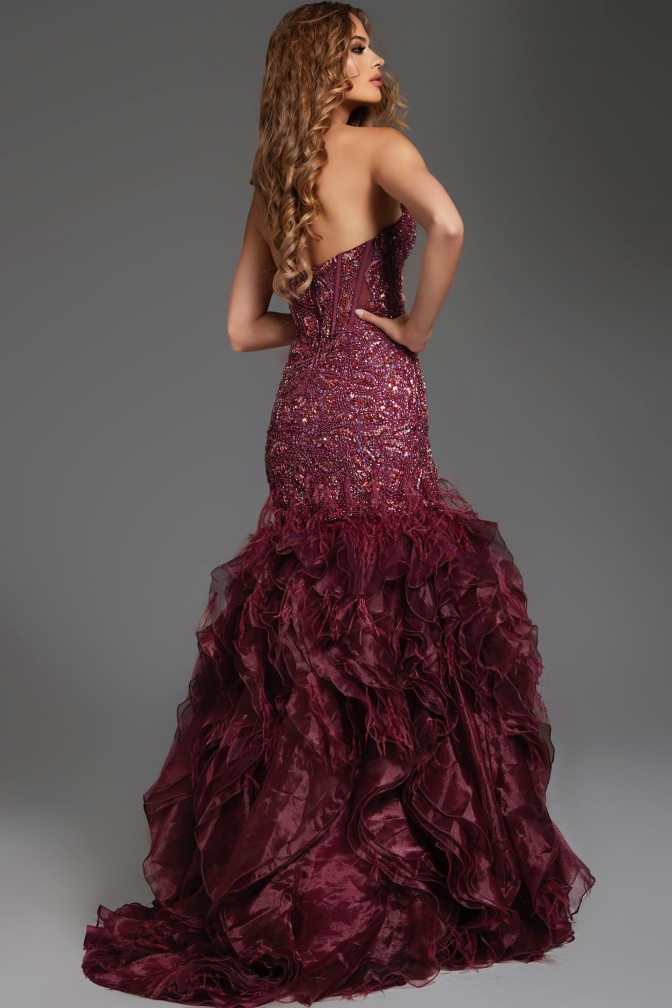 This elegant full-length gown features a captivating silhouette that gently hugs the bodice and hips before cascading into a voluminous ruffled skirt. The strapless sweetheart neckline is detailed with intricate beadwork, adding a touch of glamour. The gown’s exquisite back design mirrors the front, showcasing a flawless, elegant style.