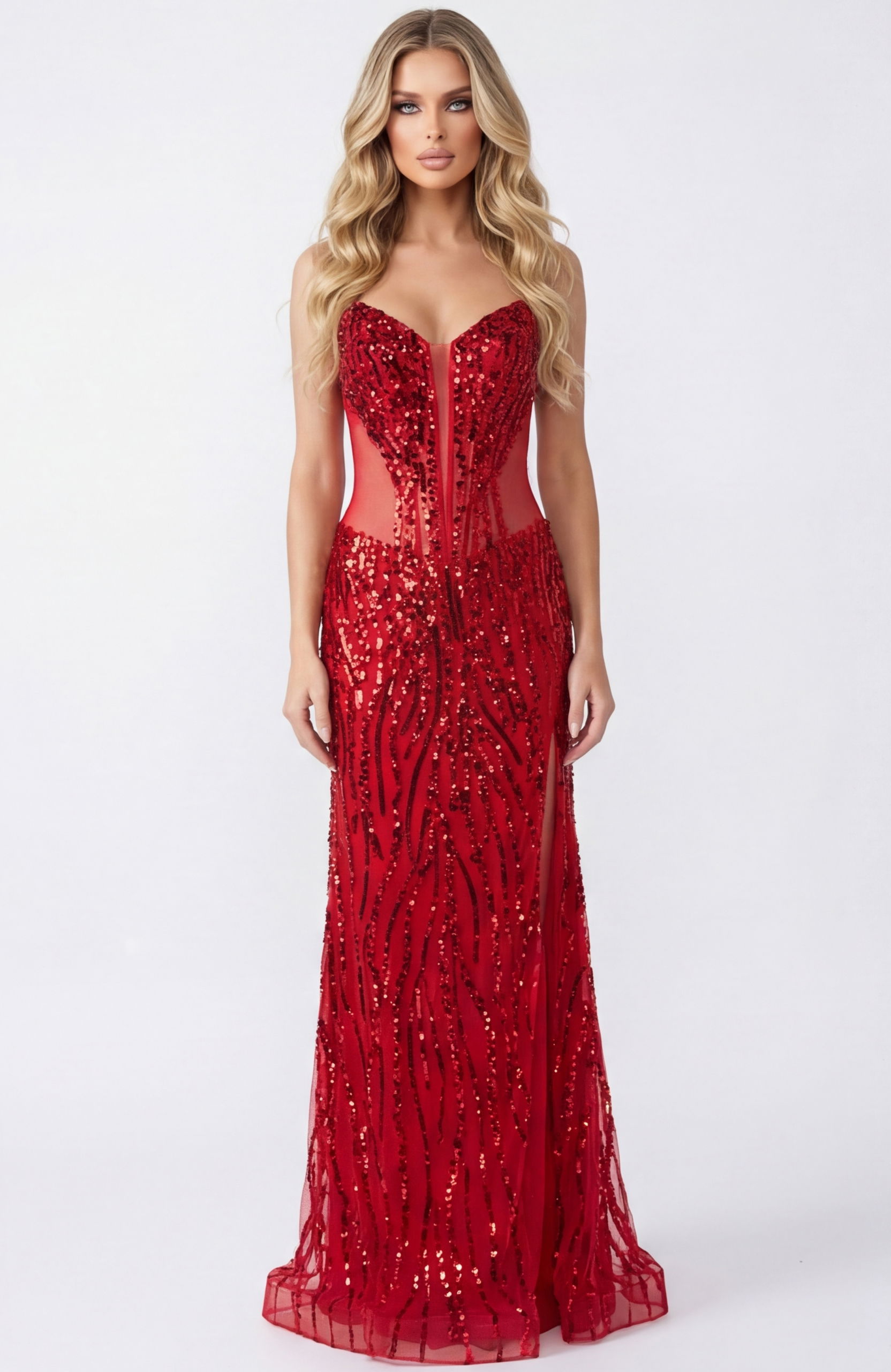 High Slit, Boned Bodice, Fully Sequined Pattern, Sheer Overlay
