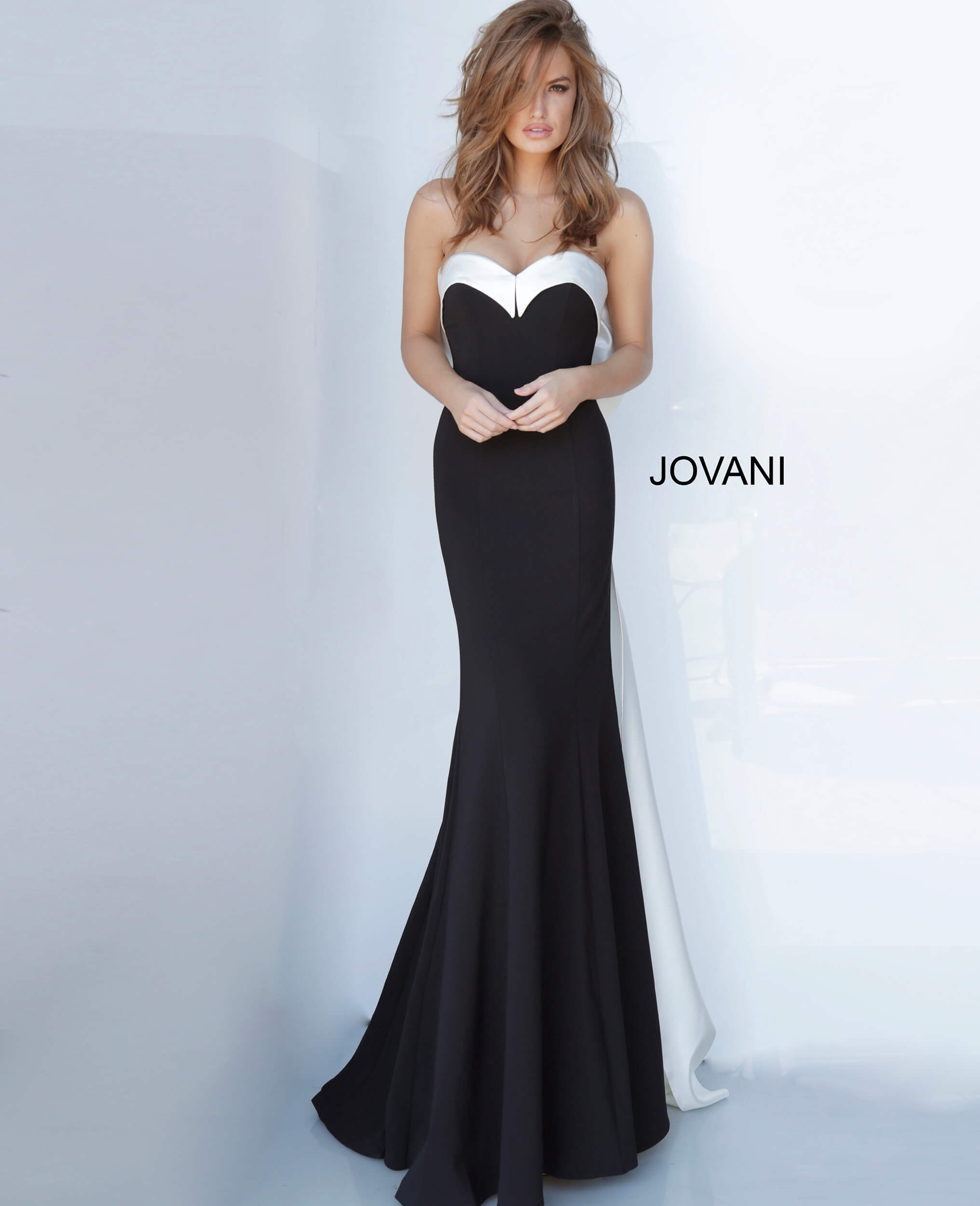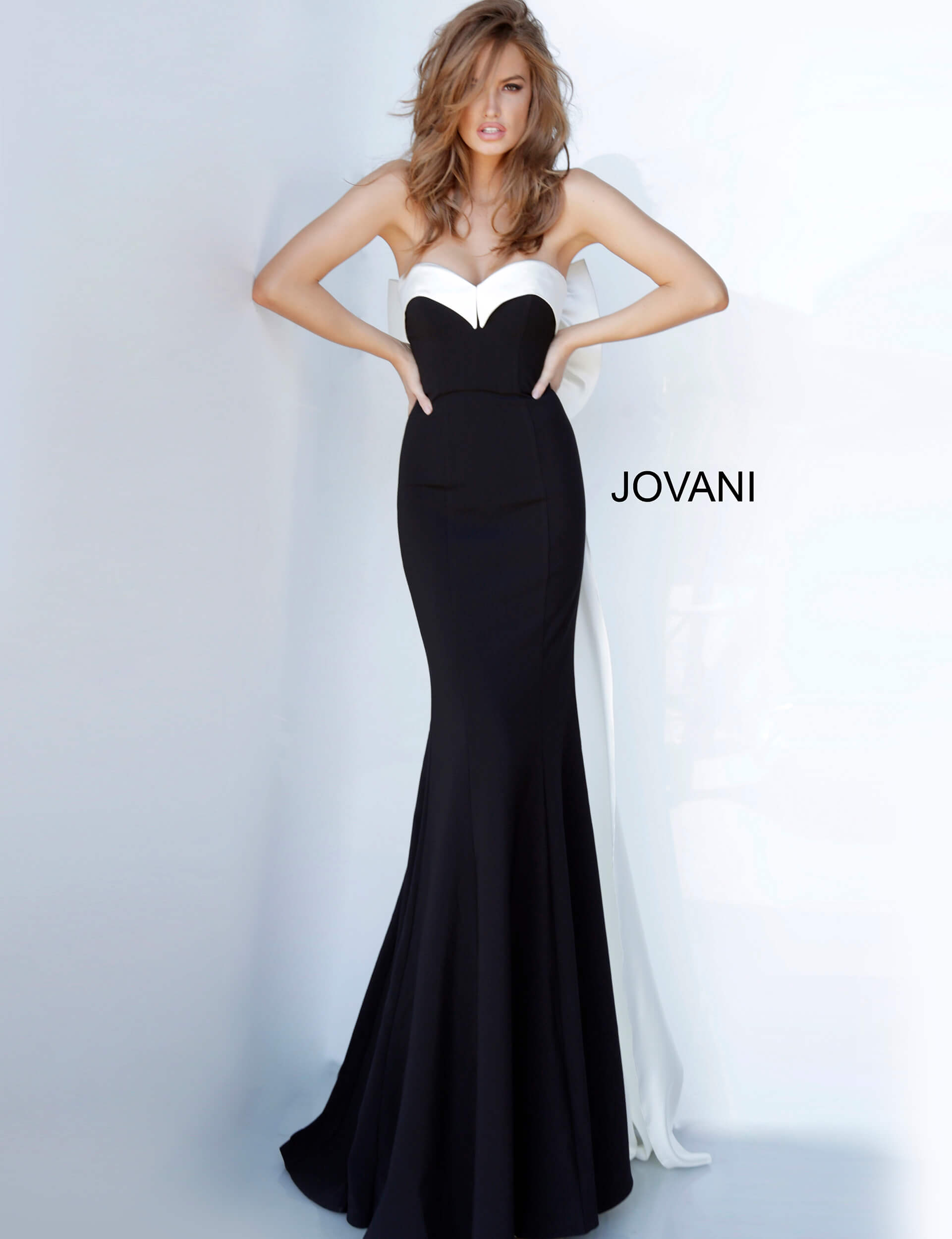 This exquisite black evening gown features a floor-length mermaid silhouette, elegantly fitted through the bodice and hips, flaring out at the knee. The gown is beautifully designed with a sweetheart neckline and no sleeves, accentuating the shoulders and collarbone. A standout feature is the dramatic oversized bow at the back, adding a touch of luxurious flair. The gown’s smooth lines and sophisticated design make it a perfect choice for formal events.