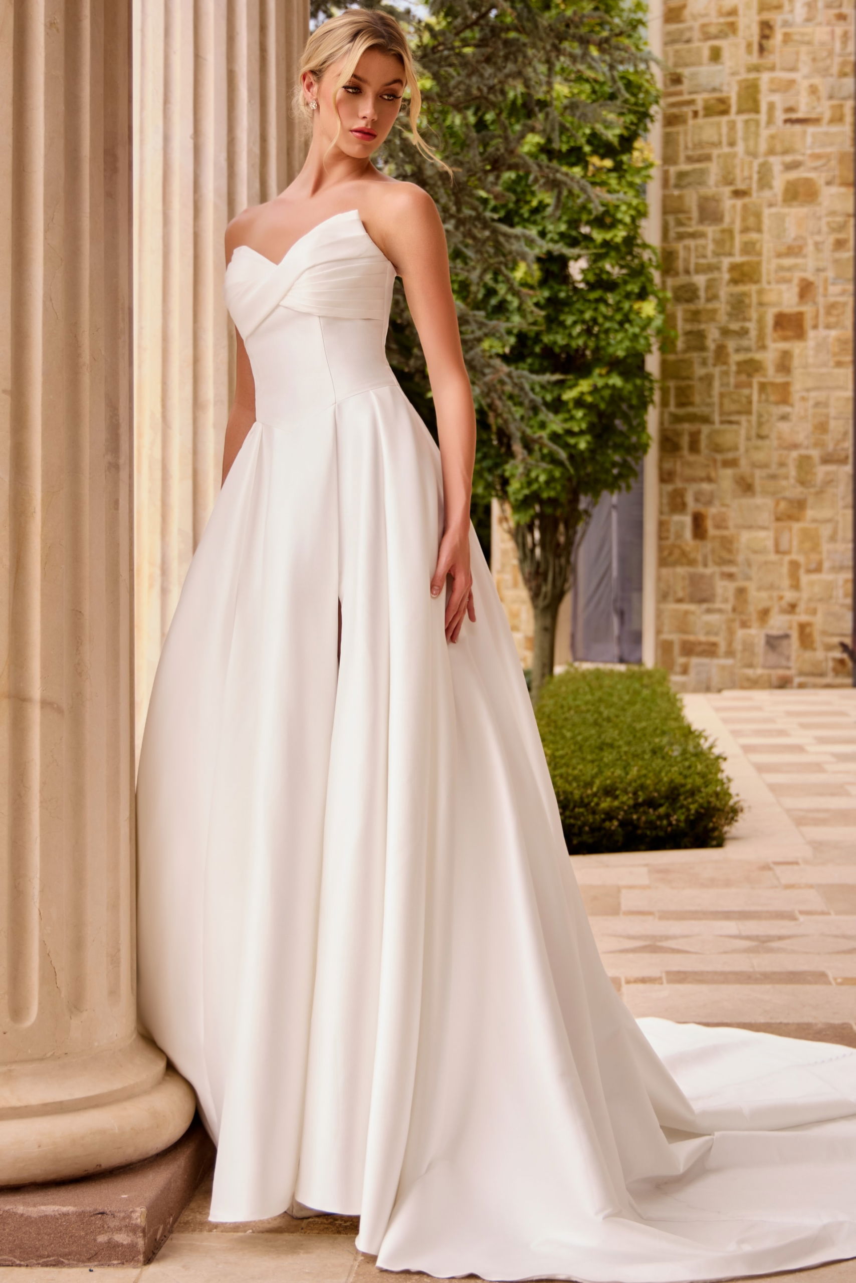 High Slit, Pleated Bodice, Button Back Detail, Sweep Train