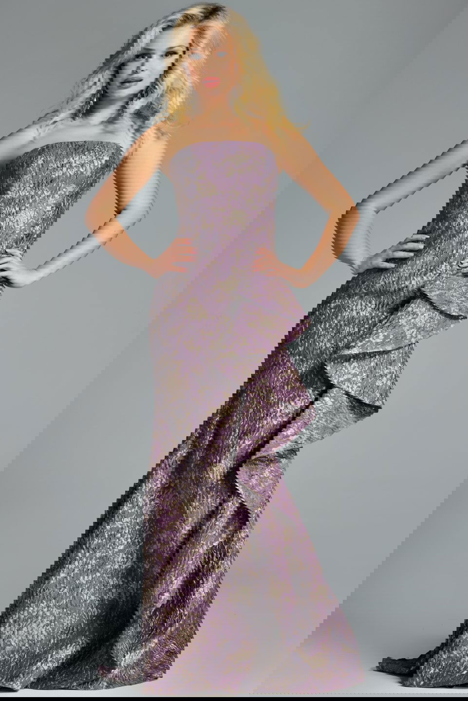Elegant in its design, this floor-length dress features a classic mermaid silhouette that fits snugly through the bodice and hips before gracefully flaring at the knee. The sophisticated strapless neckline accentuates the shoulders, while the unique, cascading ruffle detail adds an artistic touch to the ensemble. Crafted in a rich purple hue with intricate patterns, this dress makes a striking statement at any formal event.