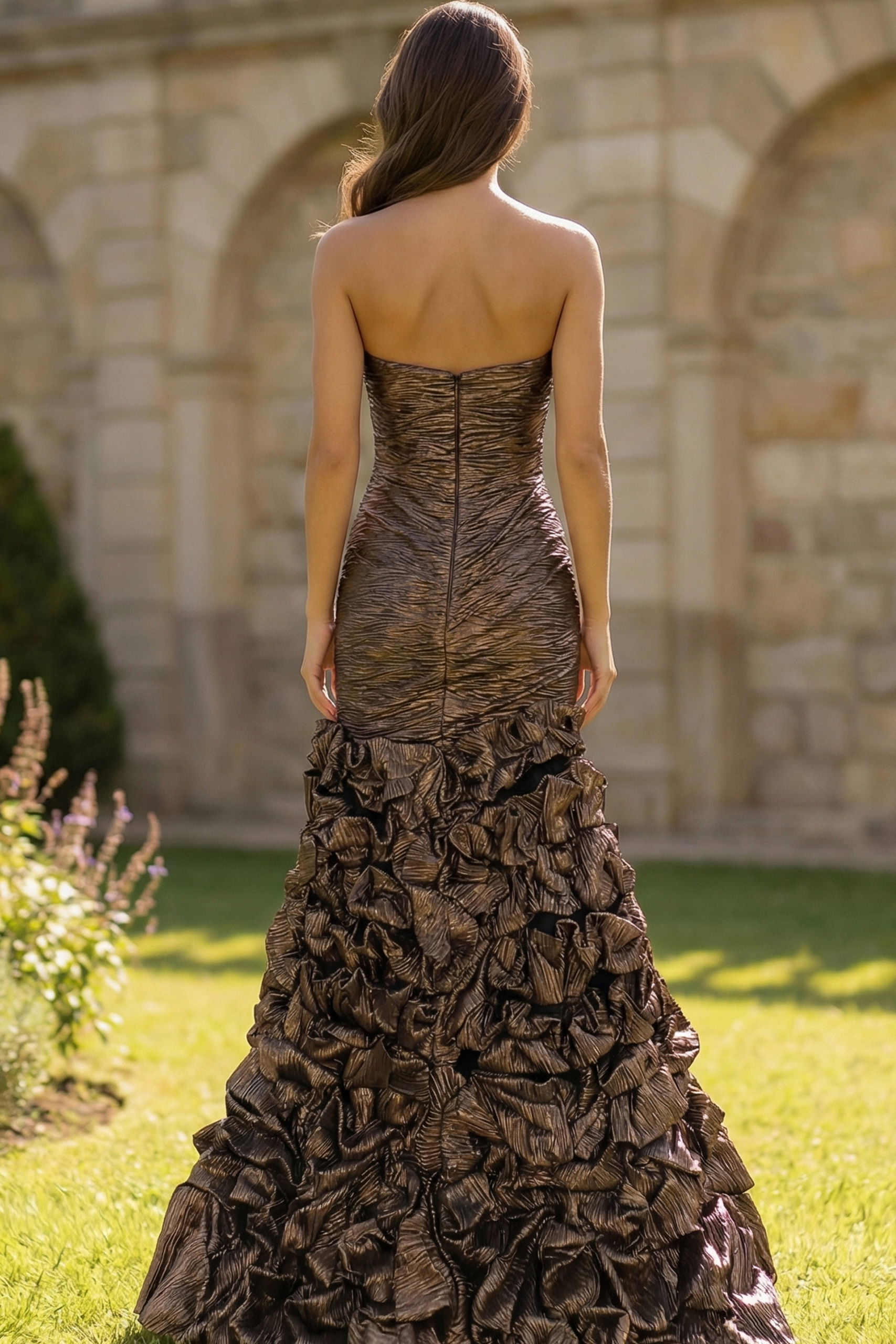 Strapless Textured Ruffle Gown With Sculpted Silhouette 47006