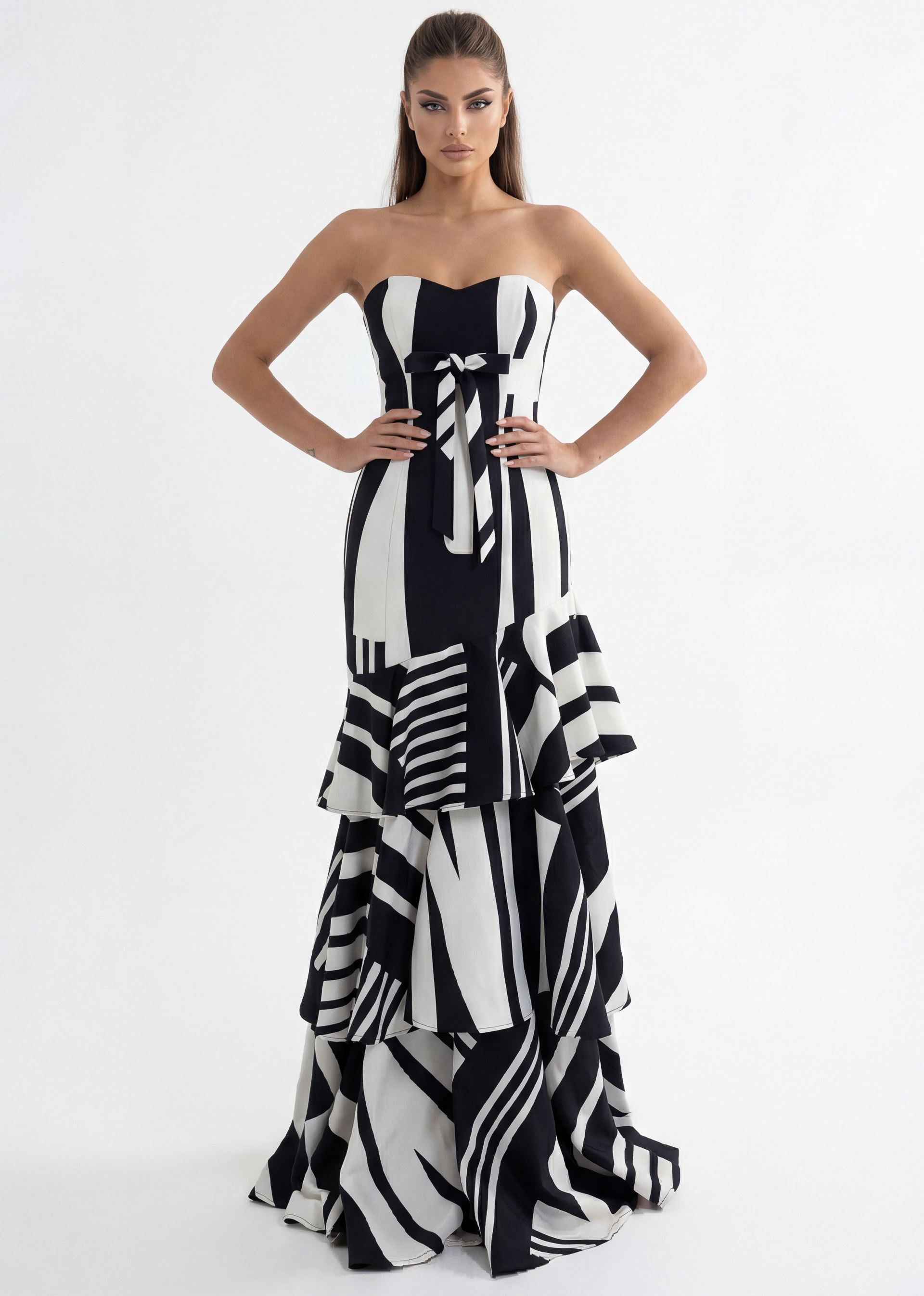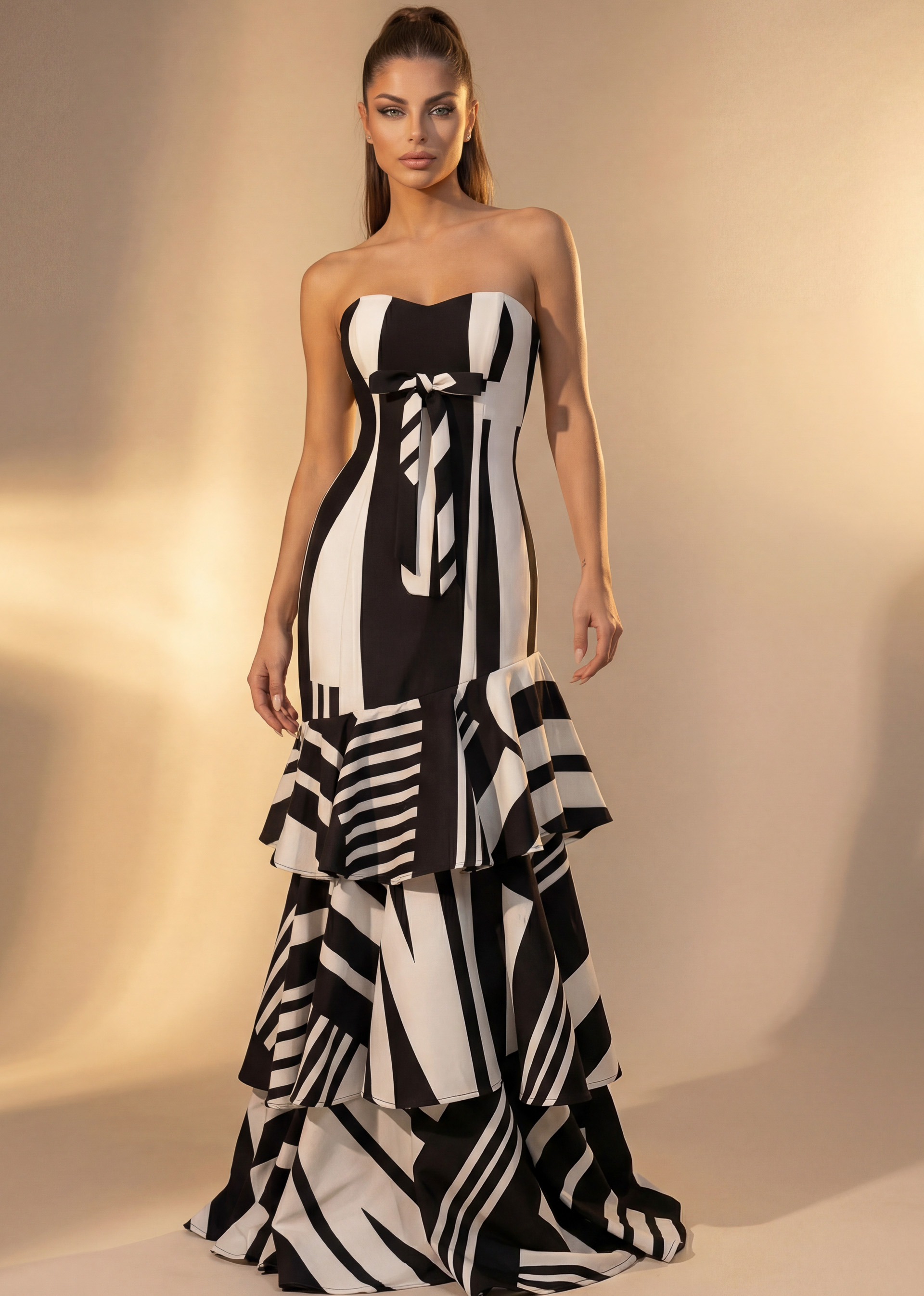 Strapless Tiered Gown with Bold Geometric Print Design 49317