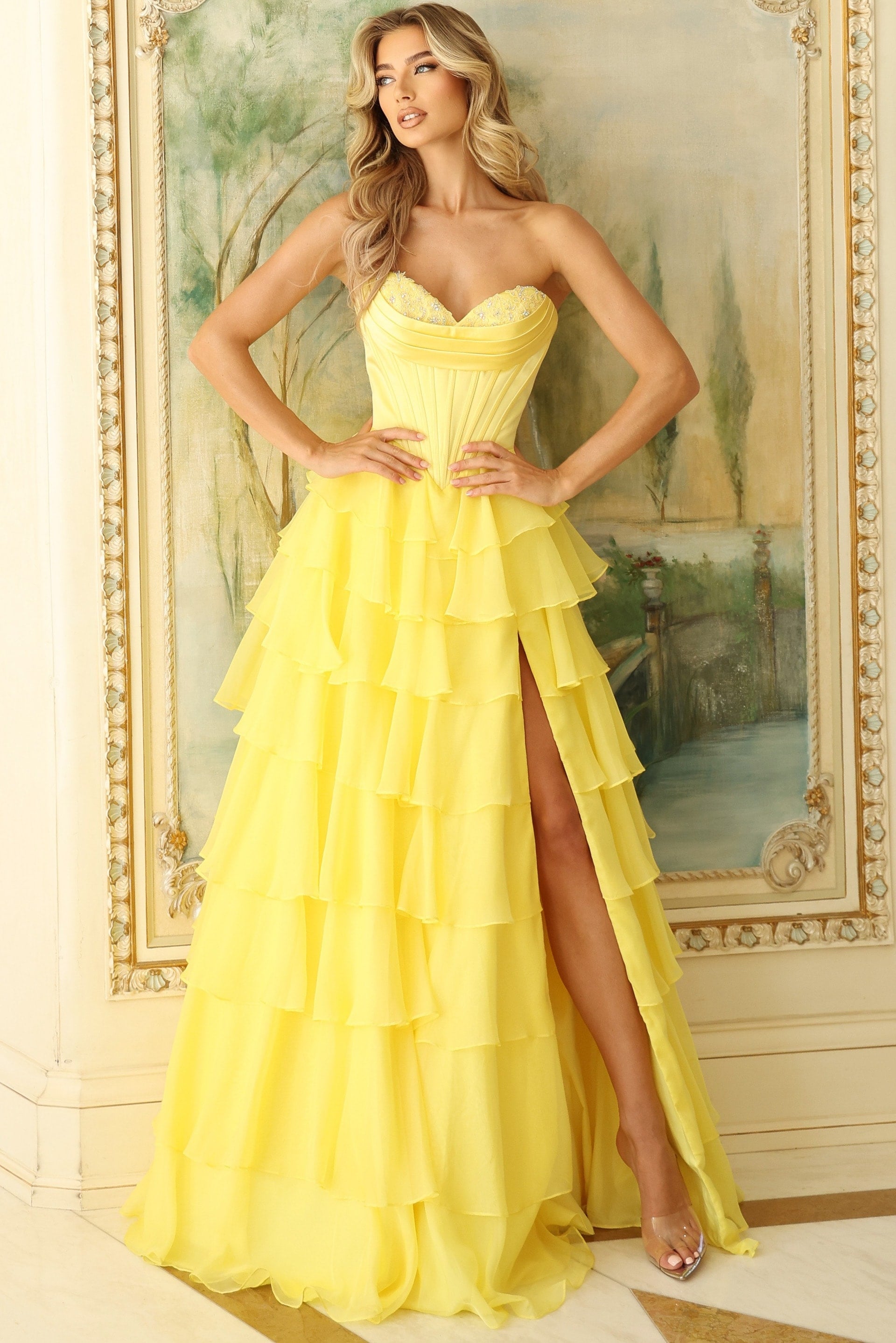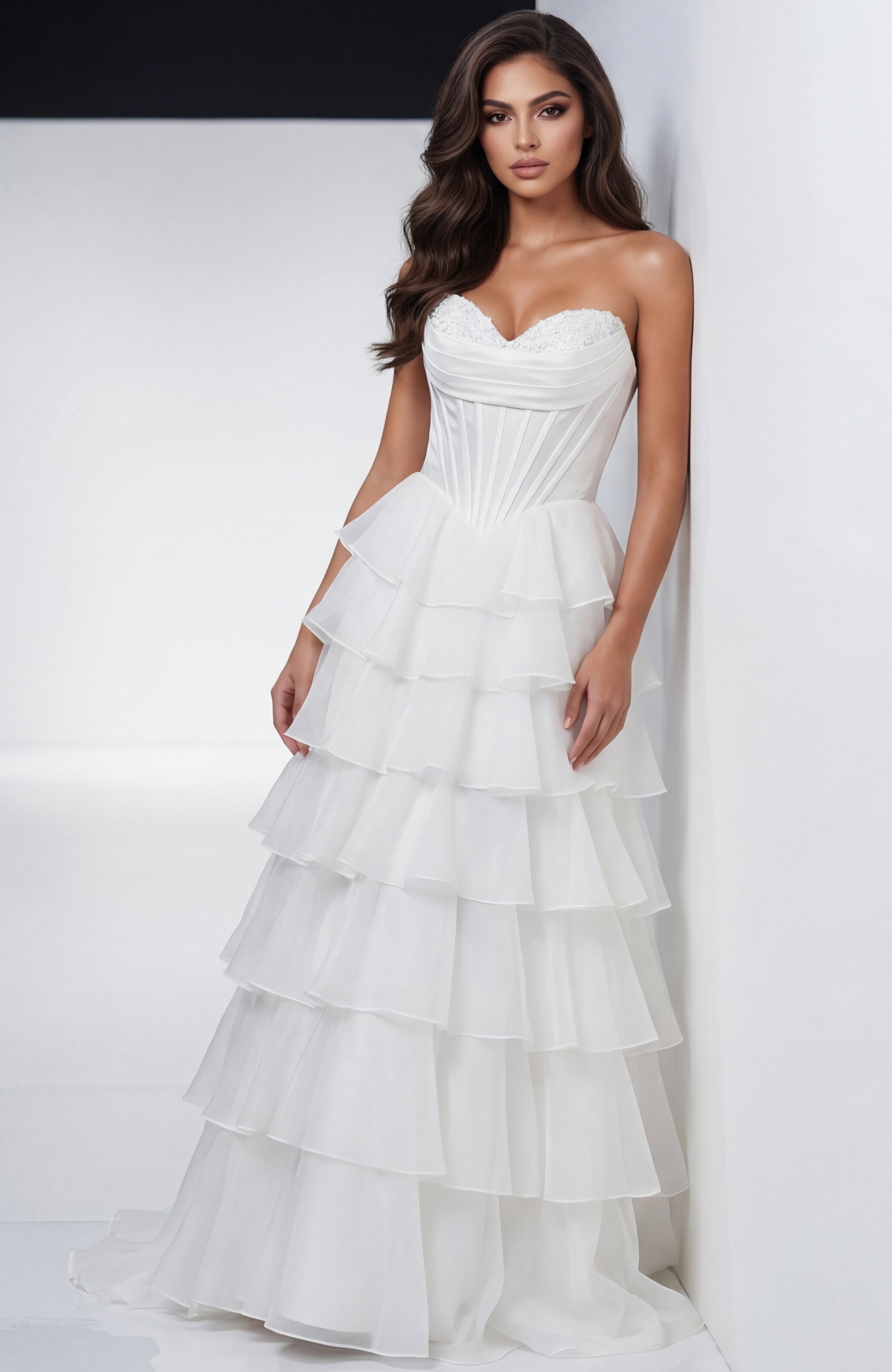 Corset Bodice, Tiered Ruffle Skirt, High Slit, Structured Waist