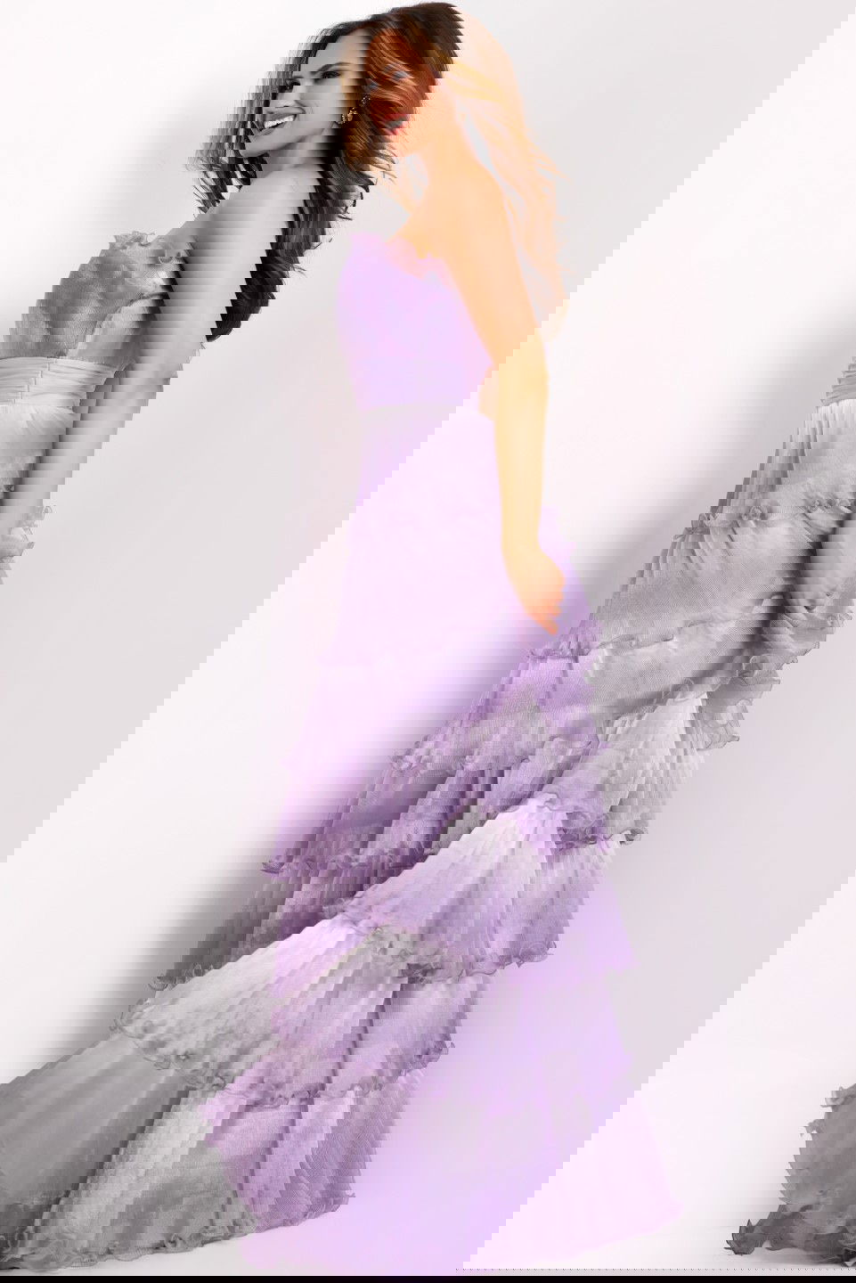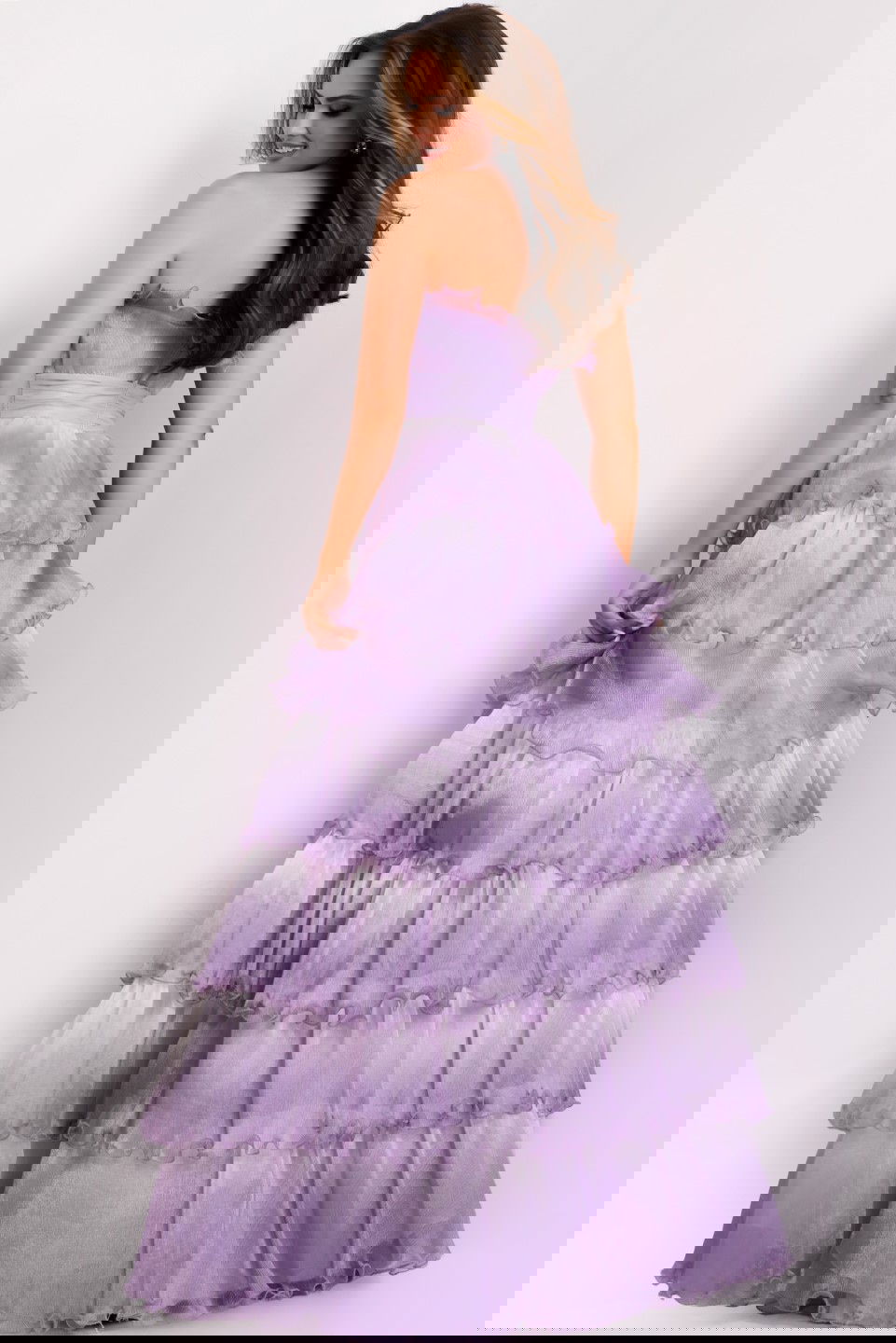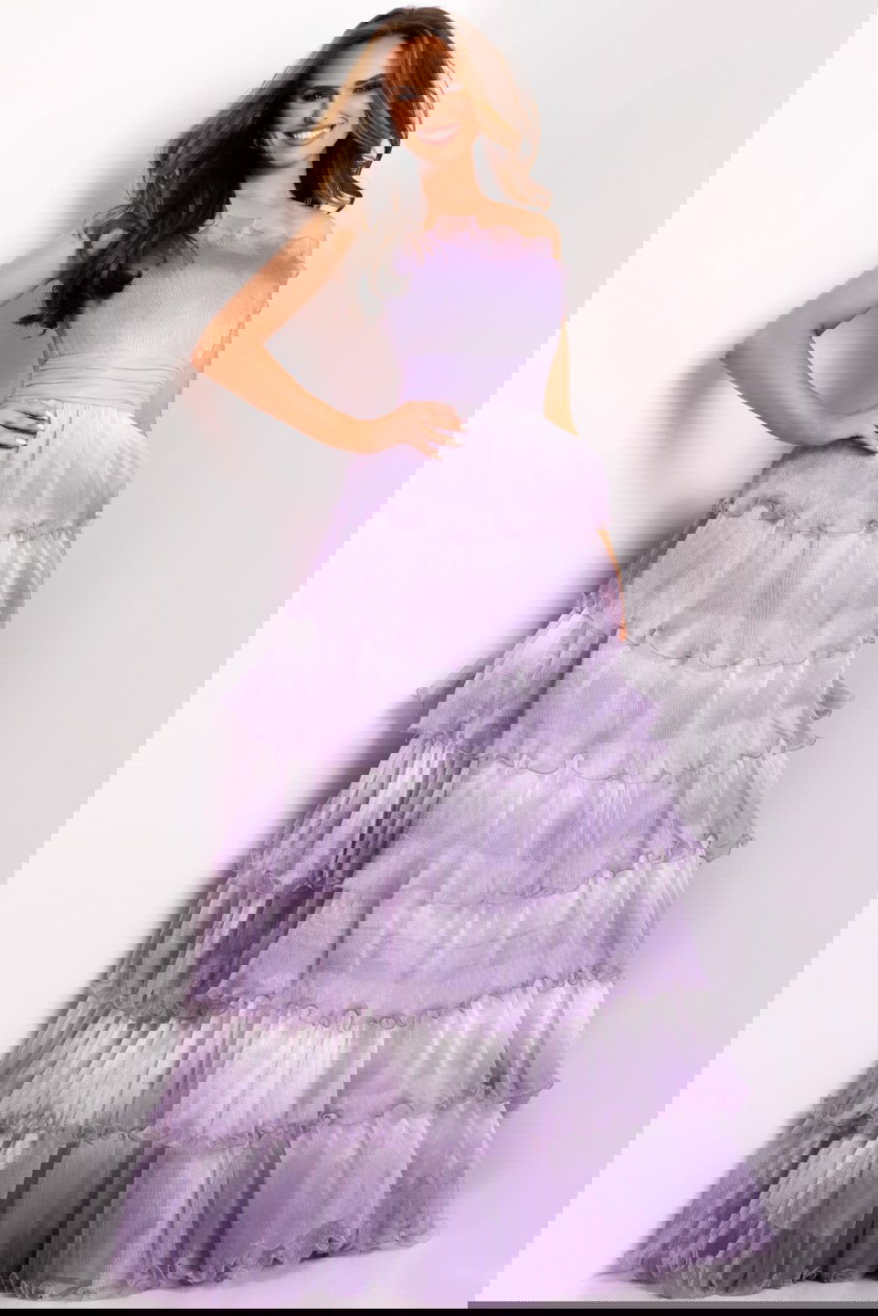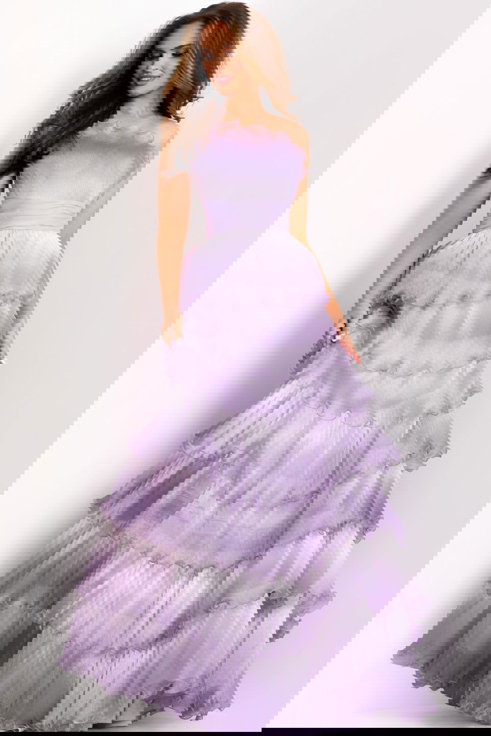 Make a lasting impression with this enchanting gown style 43263. Designed with a strapless neckline featuring delicate scalloped detailing, this dress exudes elegance. The fitted bodice transitions into a full-length, tiered A-line skirt, offering a mesmerizing flow with every step. The tulle layers are accentuated with subtle ruffle trims, adding a touch of whimsy and sophistication.