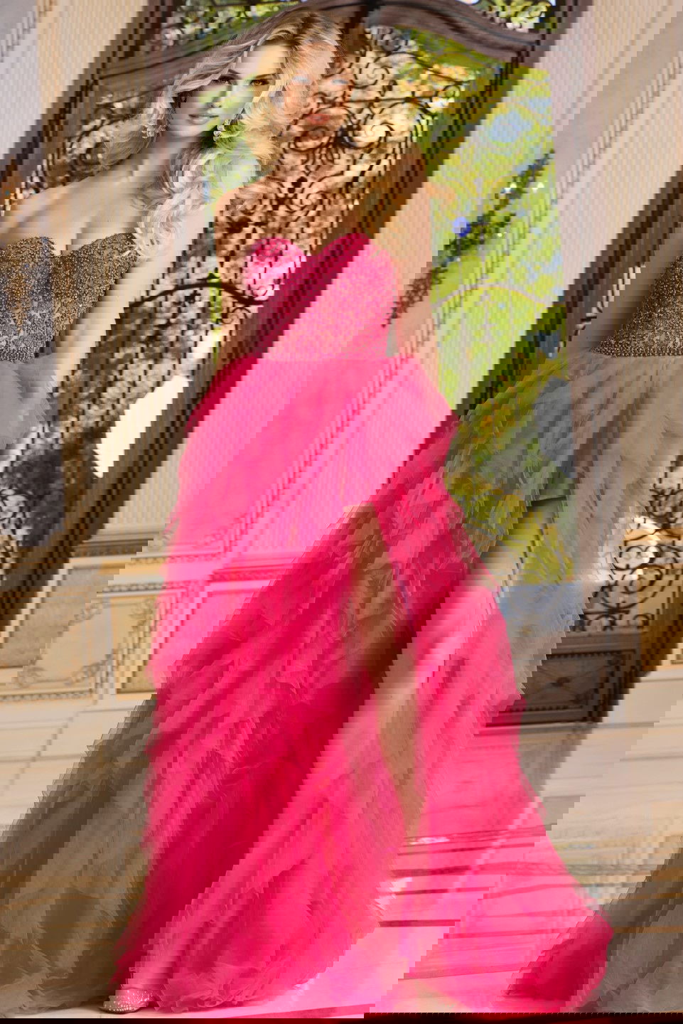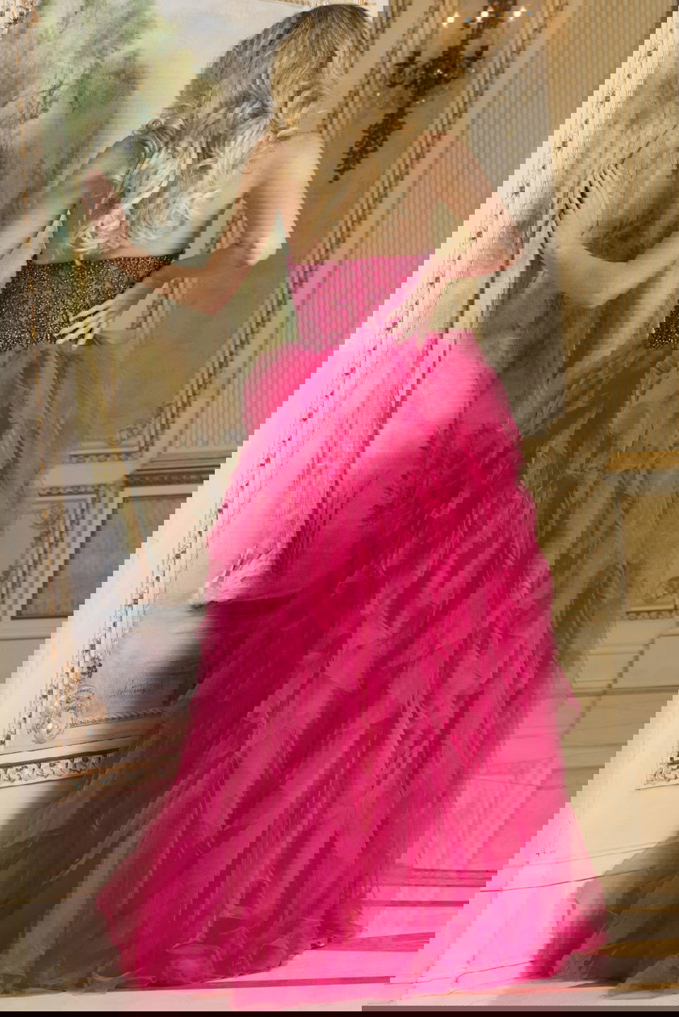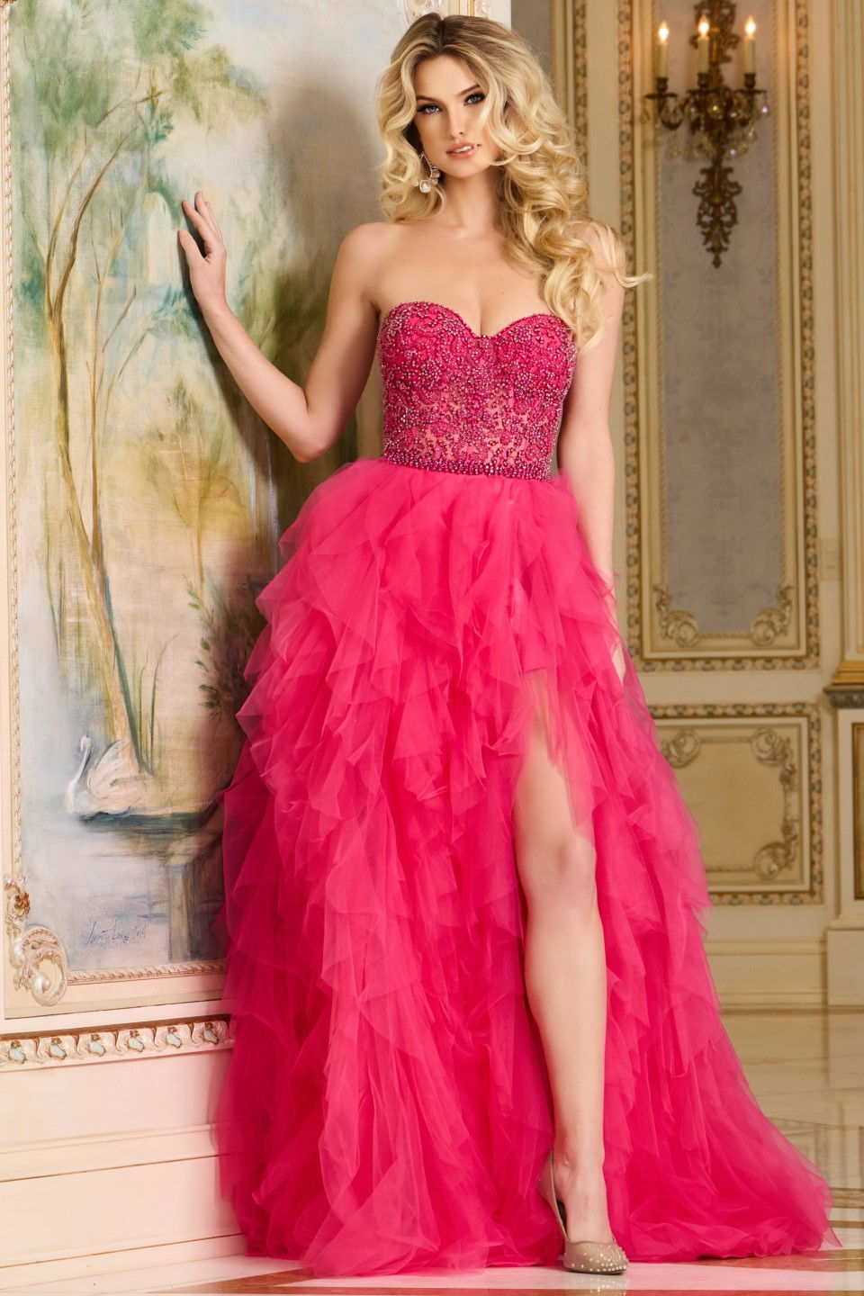 This enchanting high-low gown features a sweetheart neckline that beautifully frames the décolletage. The bodice is intricately beaded, adding a touch of sparkle and glamour. Cascading layers of ruffled tulle create a dramatic silhouette, perfect for making a grand entrance. The dress is sleeveless, offering an elegant and modern appeal.