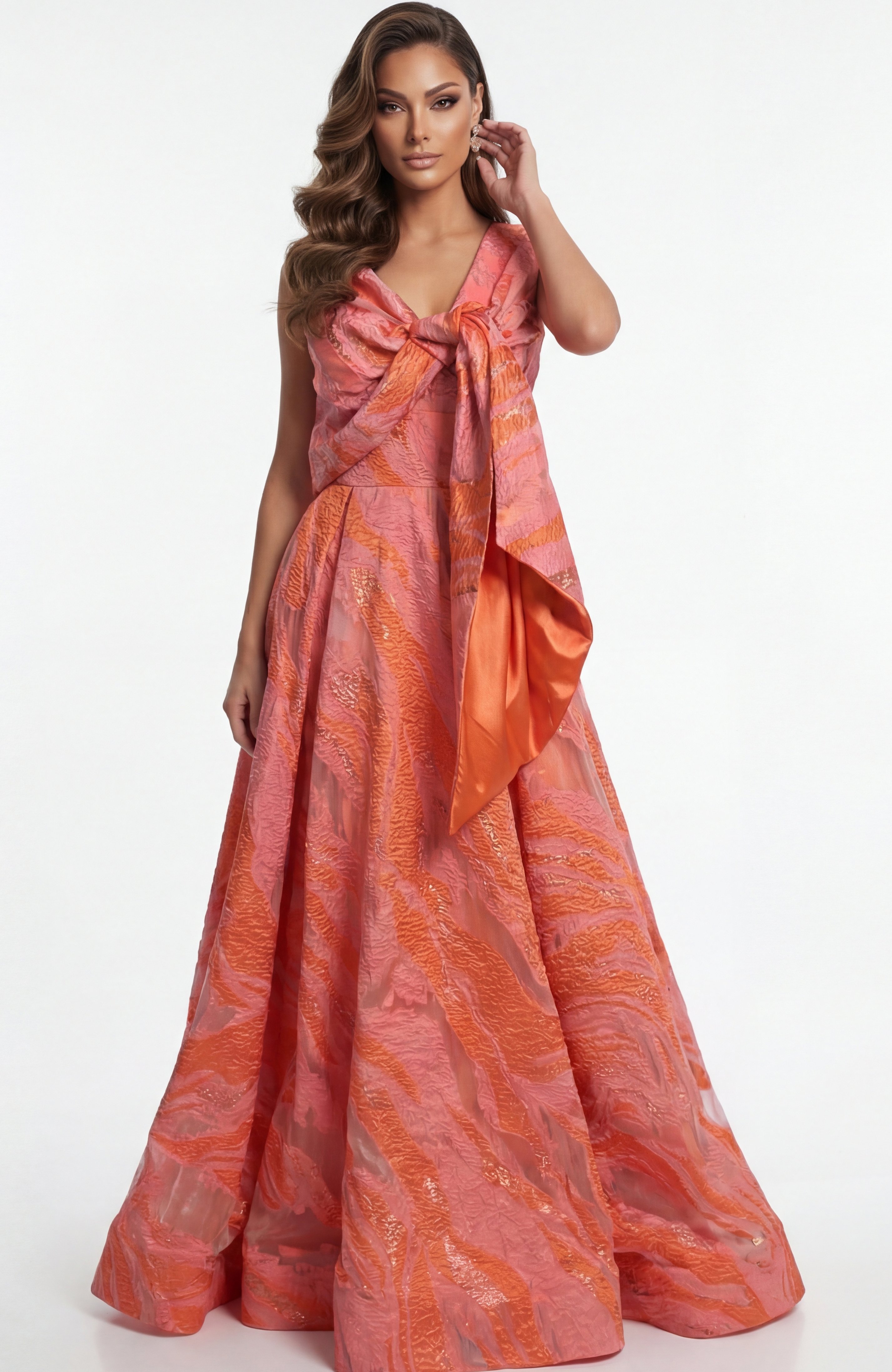 Bow Shoulder Short Sleeve Evening Gown 48945
