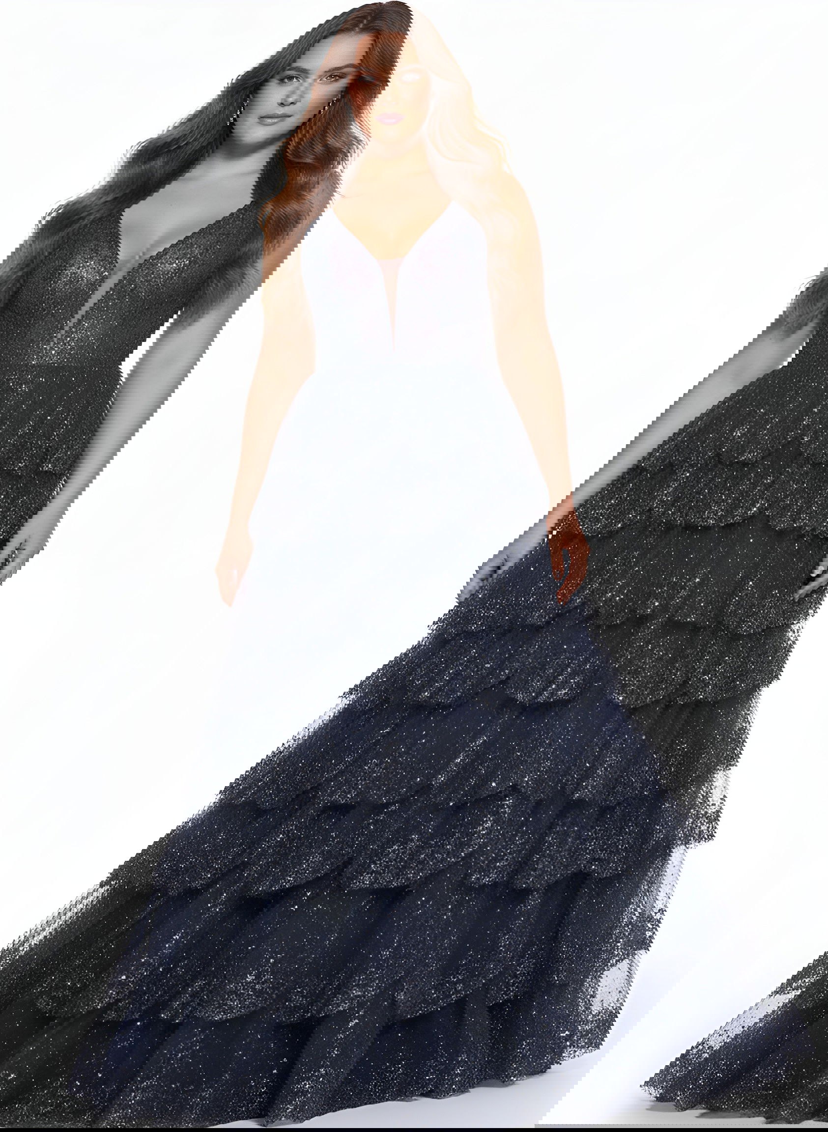Tiered Glitter Ball Gown with Deep V-Neck 43198