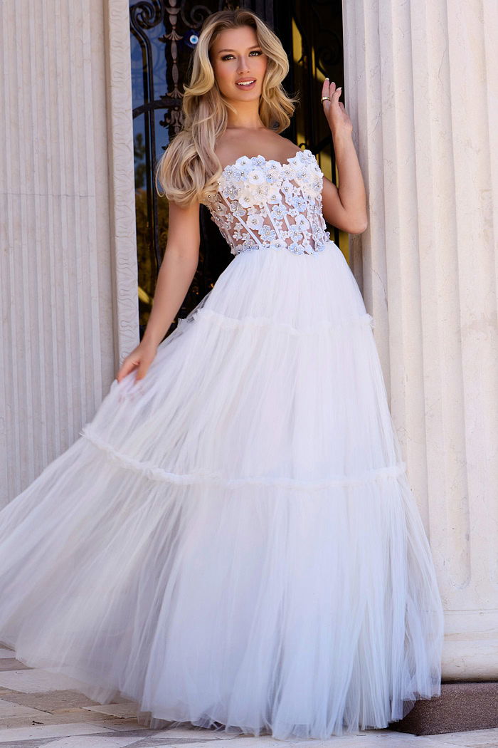 Sheer corset bodice with 3D floral appliqués, tiered tulle skirt, lace-up back