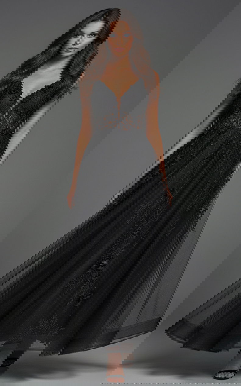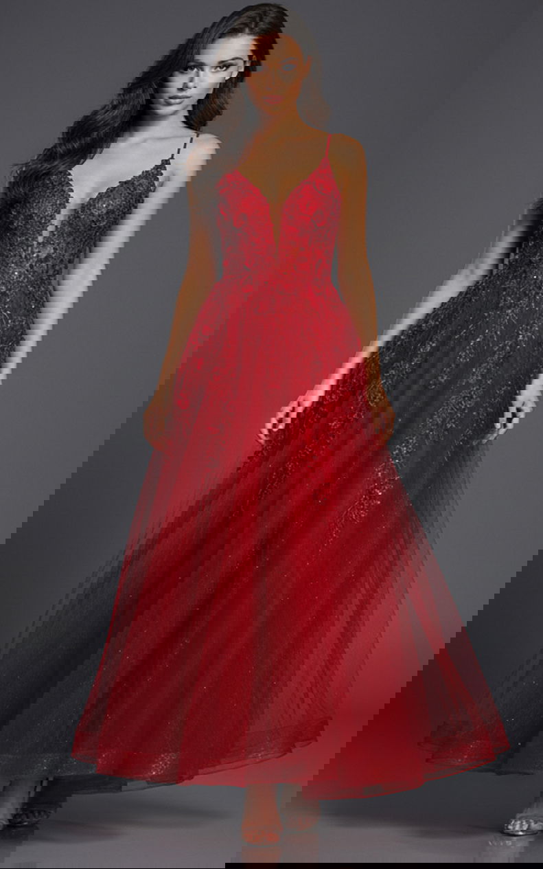 Tulle Gown with Floral Appliqués 40472: Step into the enchanting world of elegance with this exquisite tulle gown. Featuring beautiful floral appliqués, this gown is designed for the modern-day princess. The V-neckline and sleeveless design perfectly complement the floor-length A-line silhouette, creating a timeless and graceful look. Crafted from delicate tulle fabric that flows effortlessly, this gown is adorned with intricate beadwork and rosettes, adding a touch of sparkle and romance. The open back style enhances the gown’s ethereal allure, making it a stunning choice for any special occasion.