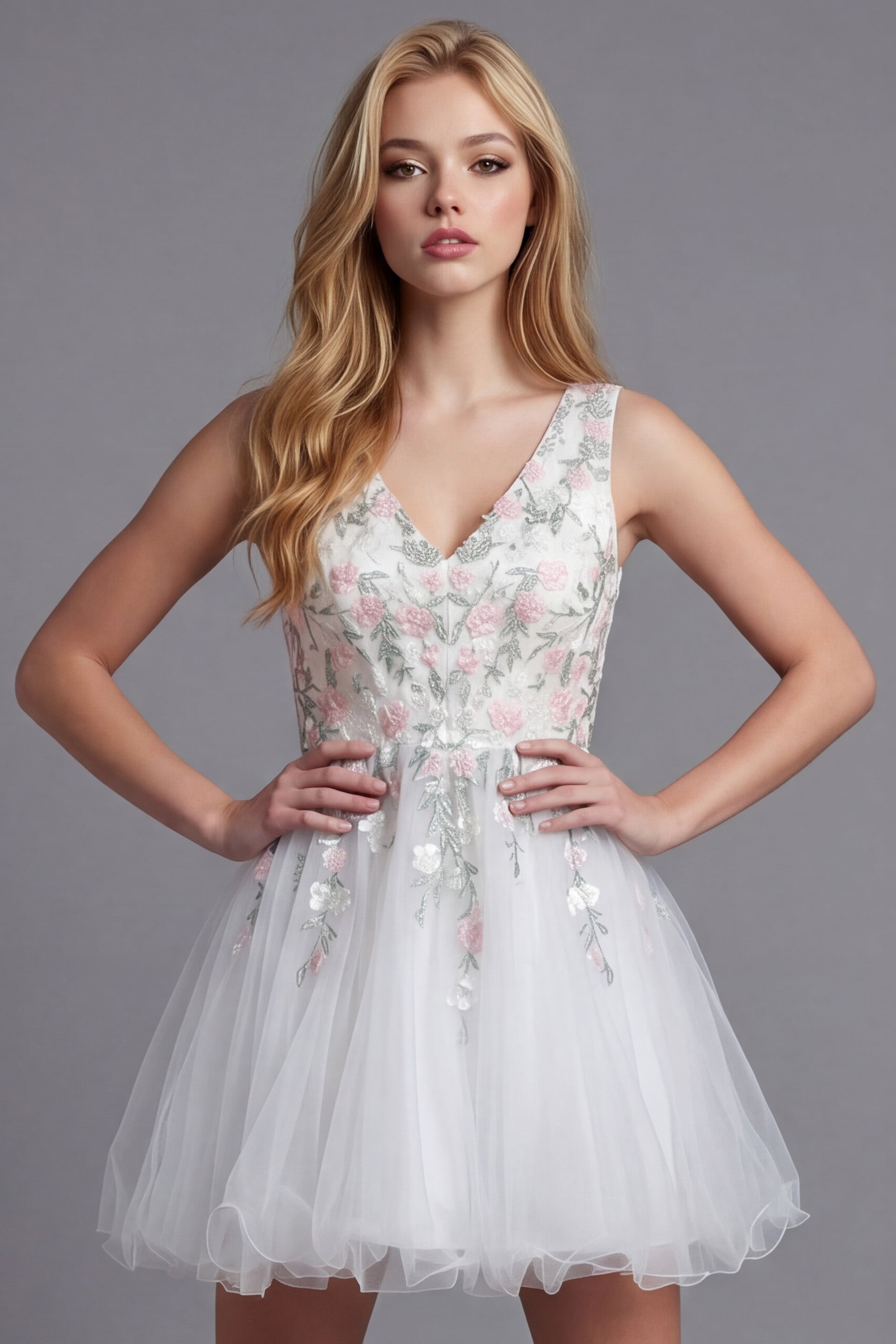 Tulle Mini Dress with Pink 3D Floral Embroidery K52183