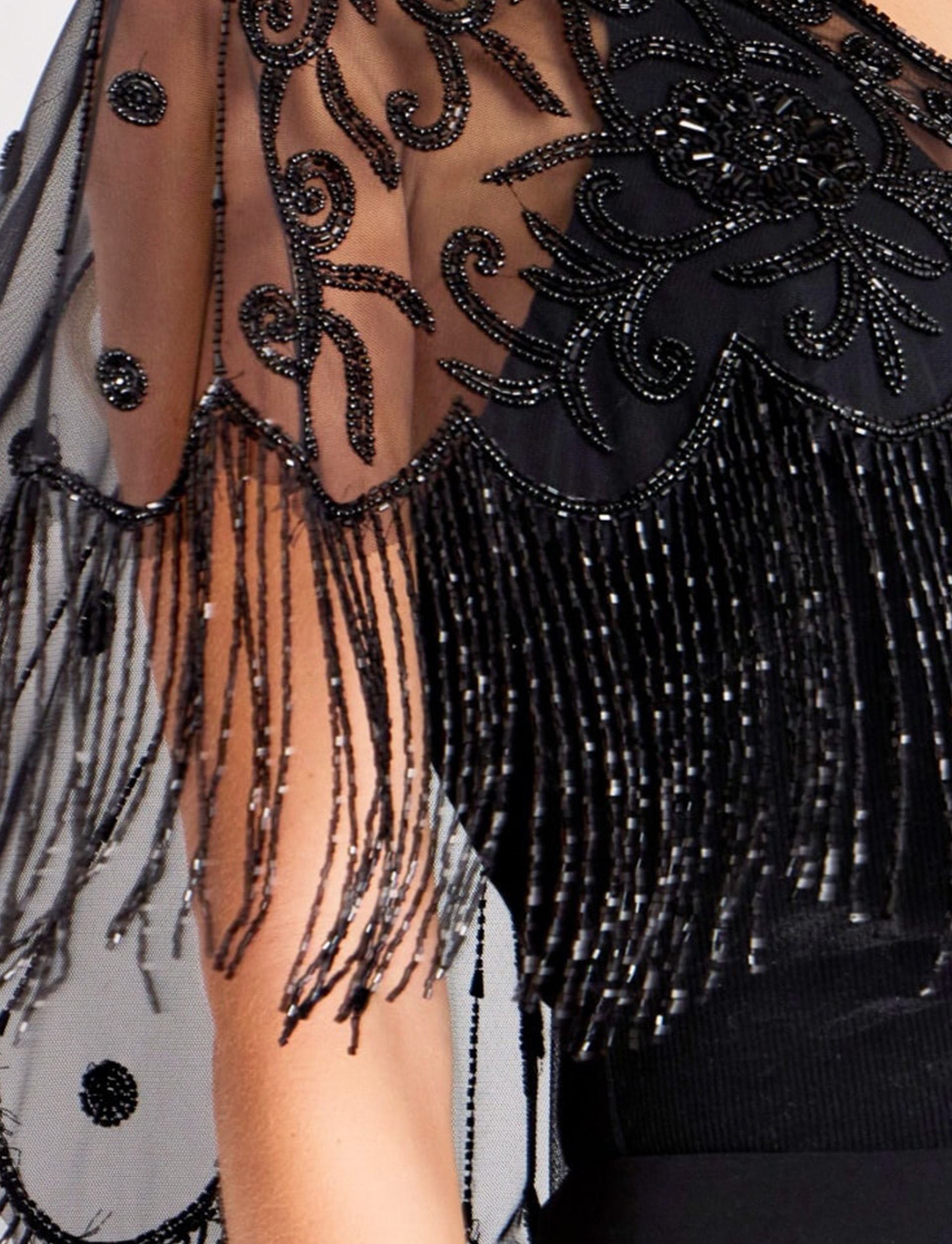 Elevate your evening attire with this stunning dress featuring a sophisticated capelet adorned with exquisite beadwork. The V-neckline lends a classic elegance, perfectly complemented by the intricate embellishments that extend across the sheer overlay. The standout feature of this piece is the luxurious beaded fringe that cascades gracefully, adding movement and flair to your every step. A true masterpiece designed for elegance and sophistication.