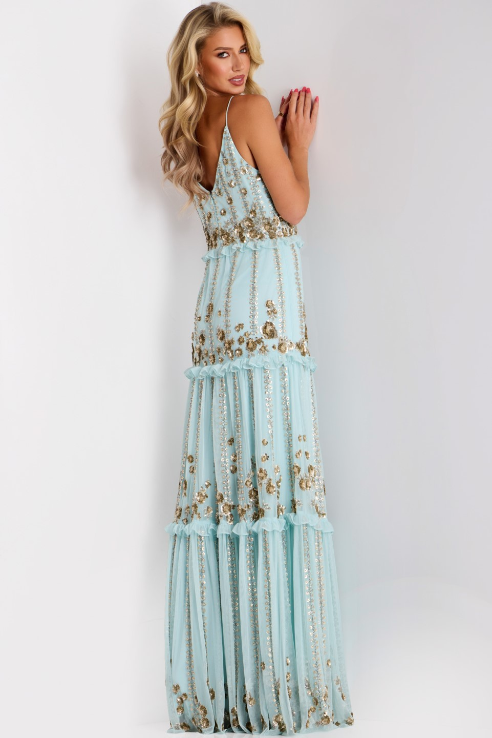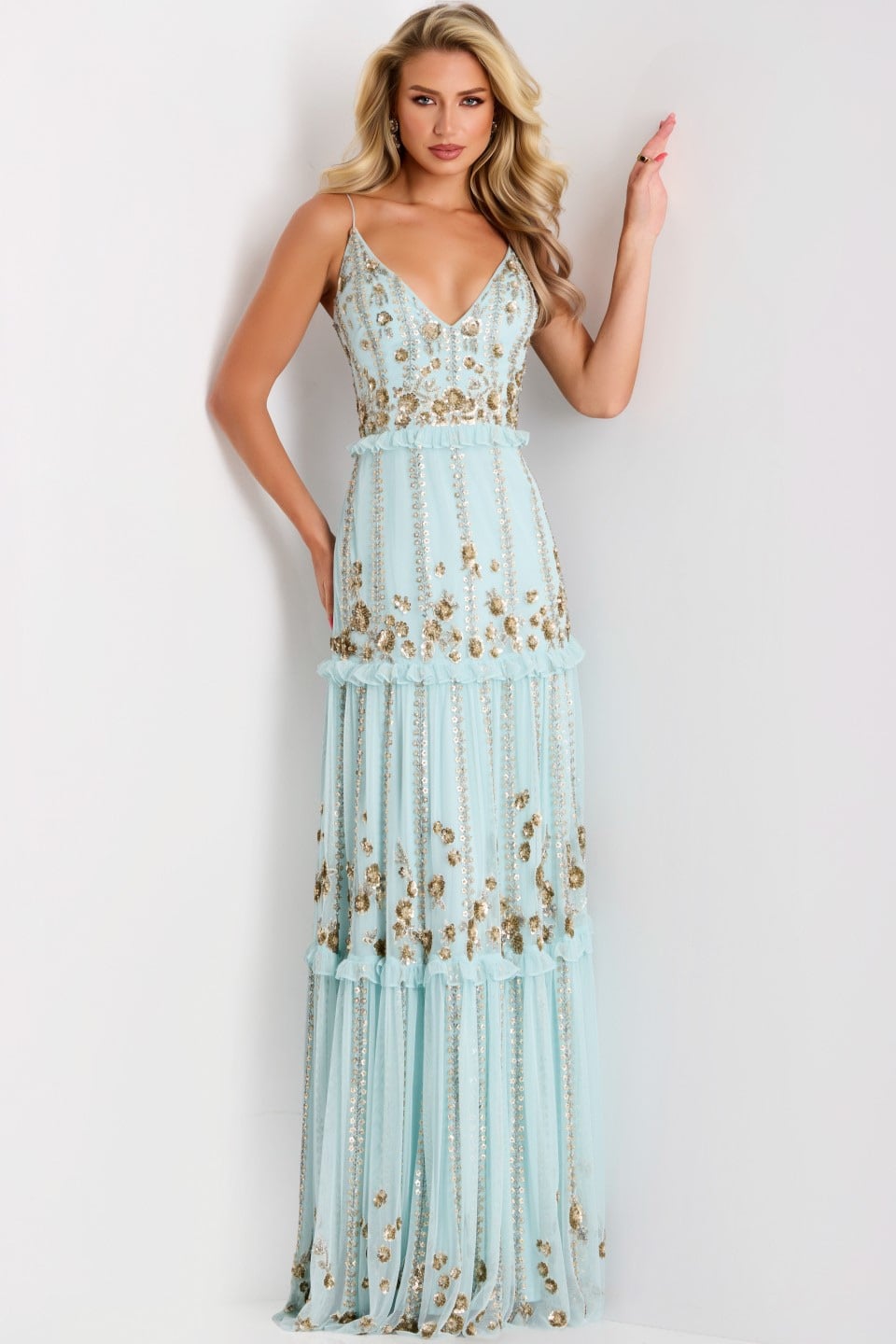 This exquisite gown features a deep V-neckline and delicate shoulder straps, offering a touch of elegance and sophistication. The floor-length dress is beautifully fitted through the bodice and hips, transitioning into a softly layered A-line silhouette that adds movement and grace. The gown is adorned with intricate floral embroidery, accompanied by shimmering sequins that catch the light with every step. Perfect for any special occasion, this gown combines a classic shape with modern embellishments for an unforgettable look.